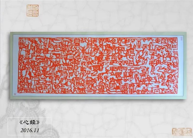 “他为了完成一幅作品,一坐就是一天。宣纸又薄又脆,中间还有纤维拉扯着,这需要超乎常人的耐心。”多多妈妈说。最令人惊喜的,是多多自己设计的作品《心经》,金石韵味、奇谲章法,篆刻的刚劲与撕纸的柔美合二为一。“有朋友来家里看到,就说远远一瞧,好像有流水,有小桥,有一个个故事在里面。”