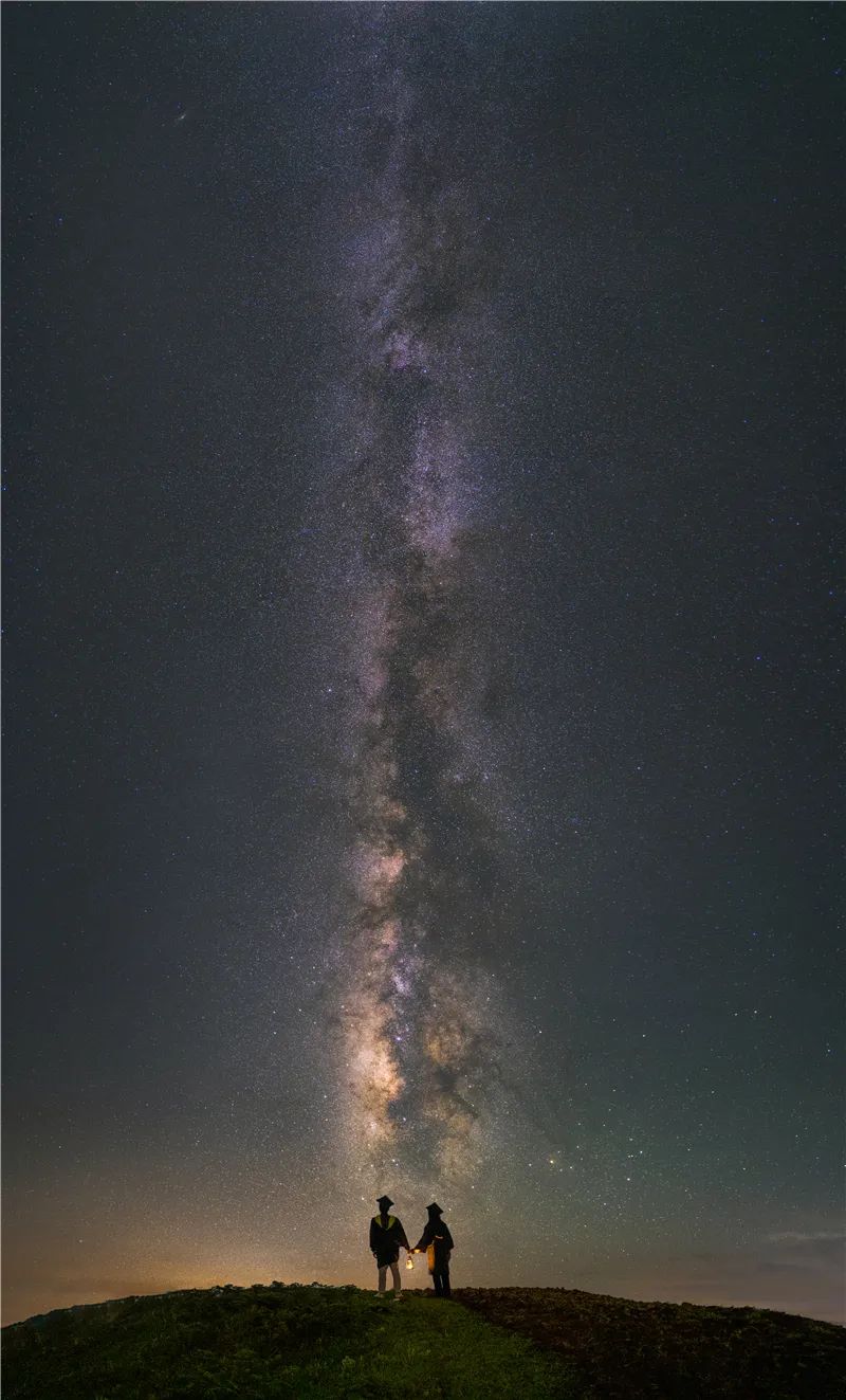 垂直延伸的银河铺展在画面正中,亿万颗繁星组成的光带将整个暗夜描绘得壮阔而浪漫。仅占全图不到八分之一的正下方地面,一半是荒坡,另一半则是绿地,两个身穿学士服的背影站在两片地块交界处,共同提着一盏油灯,面对夜空。