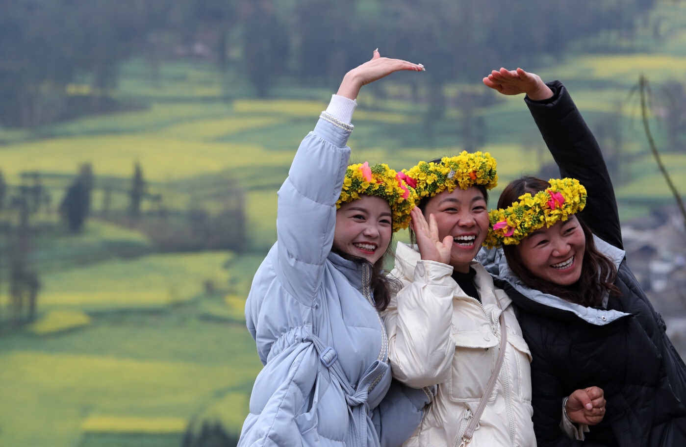 曲靖罗平油菜花海景观吸引游客打卡拍照。