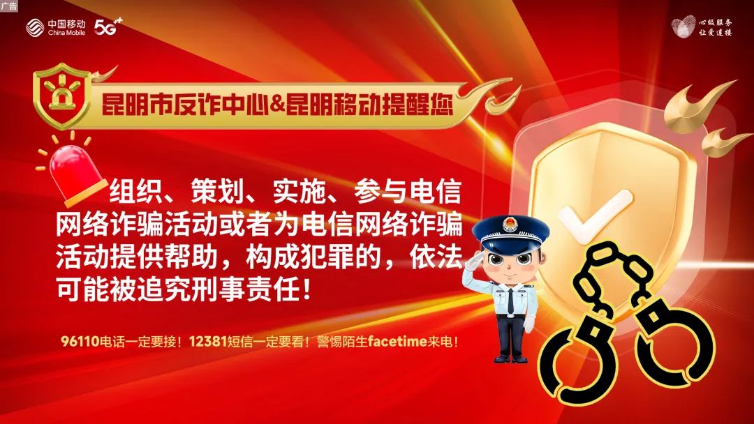 为重点打击“两卡”线索,帮助群众认识帮信罪,广泛宣传发动全民反诈,昆明市反诈中心联合中国移动通信集团云南有限公司昆明分公司,在昆明移动机顶盒开机画面中嵌入反诈宣传。