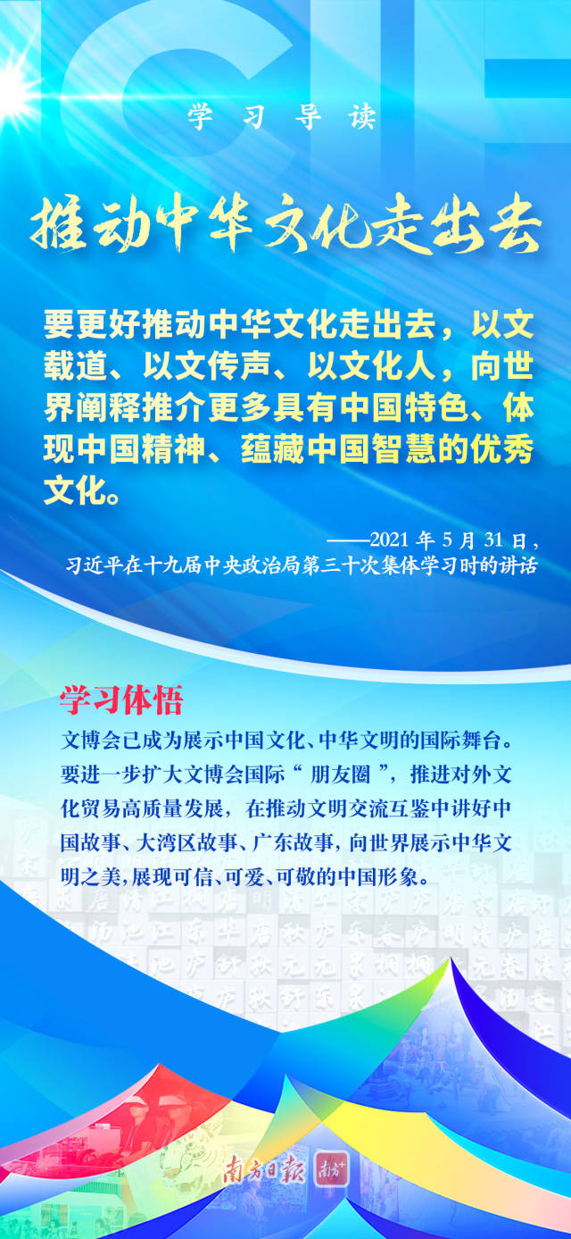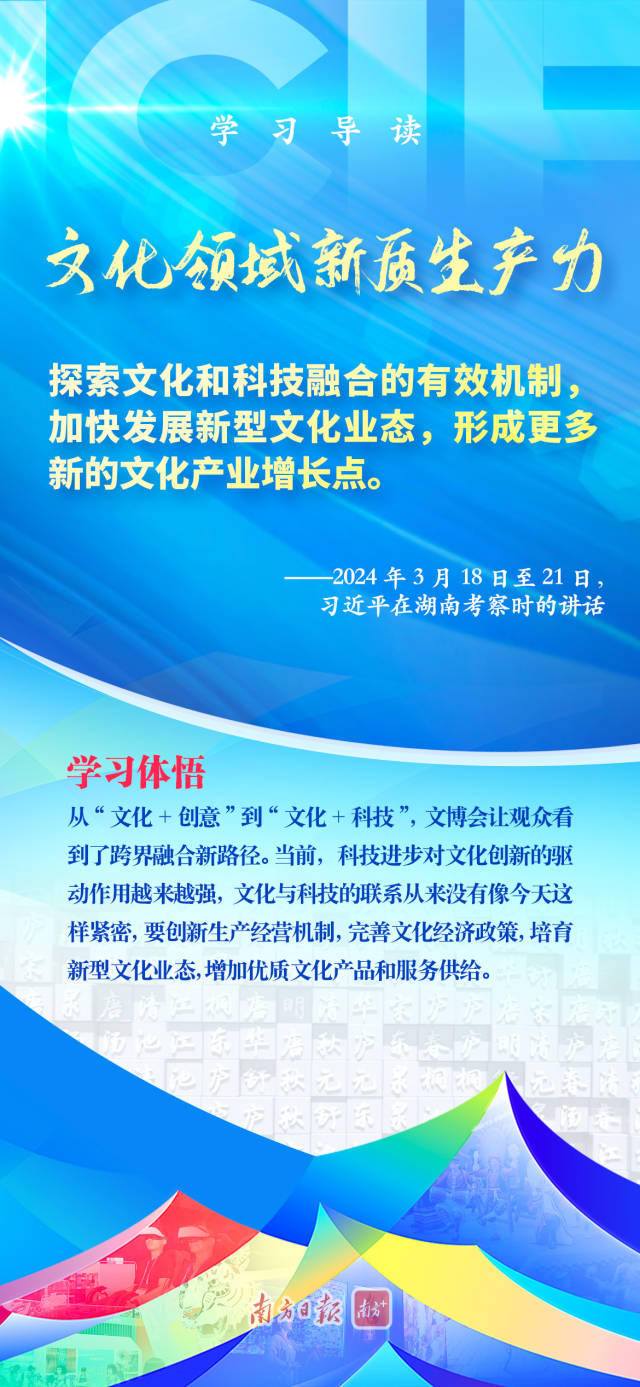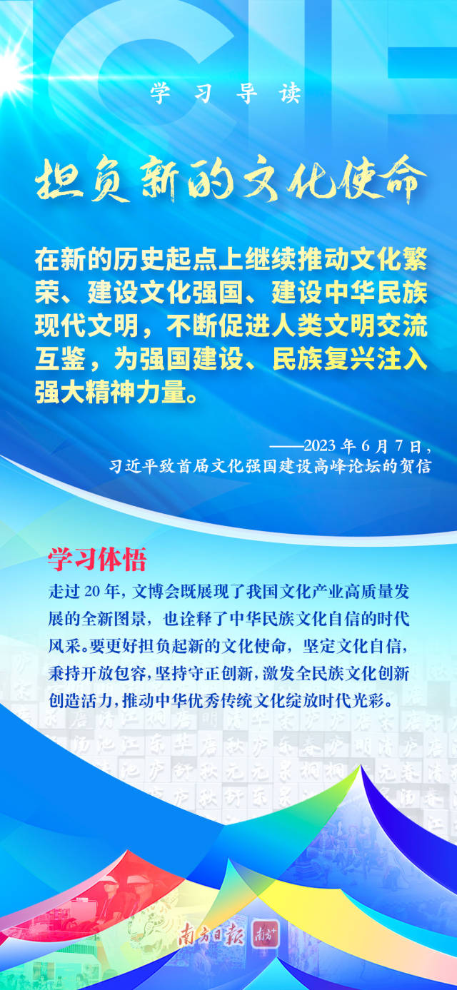 今年的文博会,深入践行习近平文化思想,肩负新的文化使命继续扬帆远航。让我们透过文博会这扇窗,深刻感悟习近平文化思想的博大精深,深刻感悟新的文化使命重任在肩。