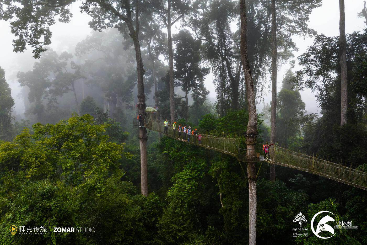 雾气中队员们乘船穿过南腊河两岸时仙气缭绕的雨林;50米高的树冠走廊高空穿越,惊险又刺激,20公里的越野跑,穿过热带雨林和村寨;露营地的“傣迪”和烟花点燃欢乐;第二天的15公里越野跑后,紧接着是7公里漂流。他们最终到达终点傣族村寨曼旦村,全力角逐“亚林赛”的最高荣誉——马帮奖。