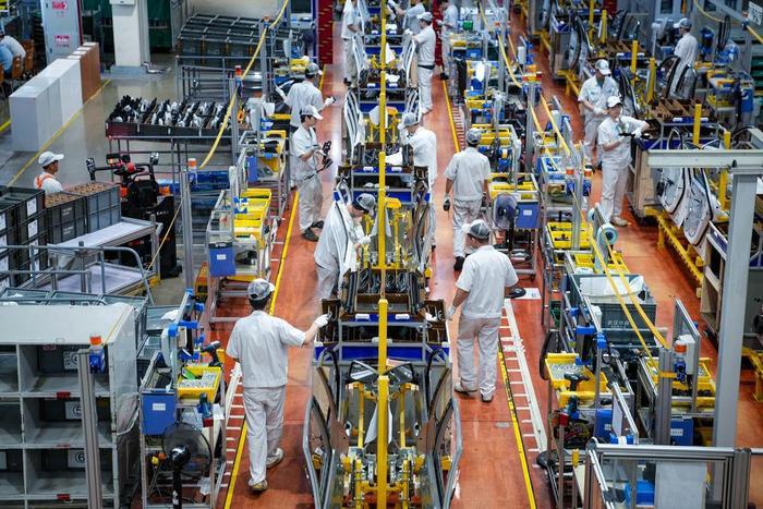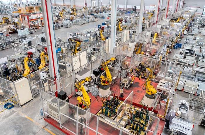 △浙江湖州市长兴经济技术开发区一家汽车部件公司,全自动机器人高速运转生产新能源汽车配件。