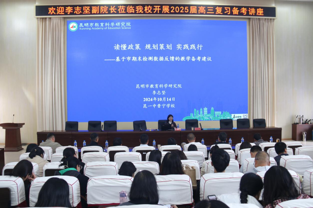 近日,昆明市教育科学研究院副院长李志坚应邀走进昆一中晋宁学校,为全体教师开展题为“读懂政策、规划策划、实践践行”的专题备考讲座。本次讲座由昆一中晋宁学校校长王爱民主持,晋宁区教体局局长李室霖等相关领导出席。