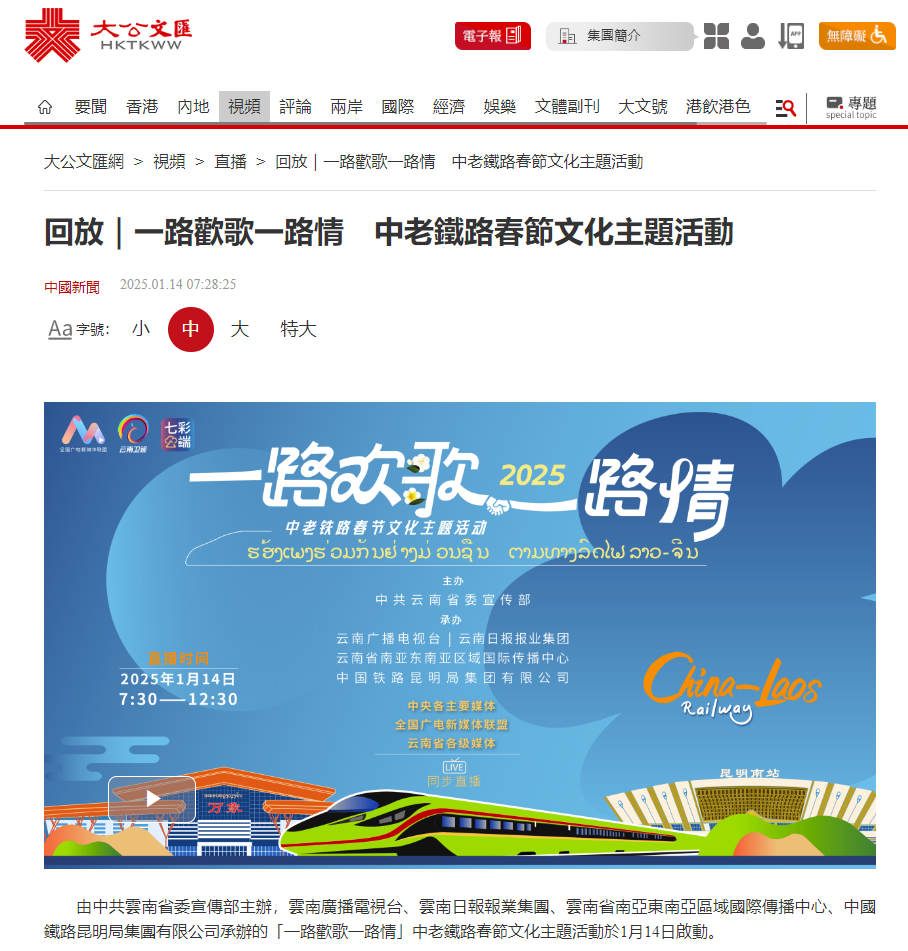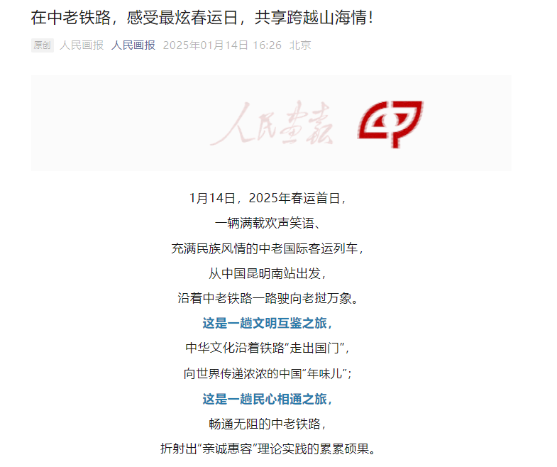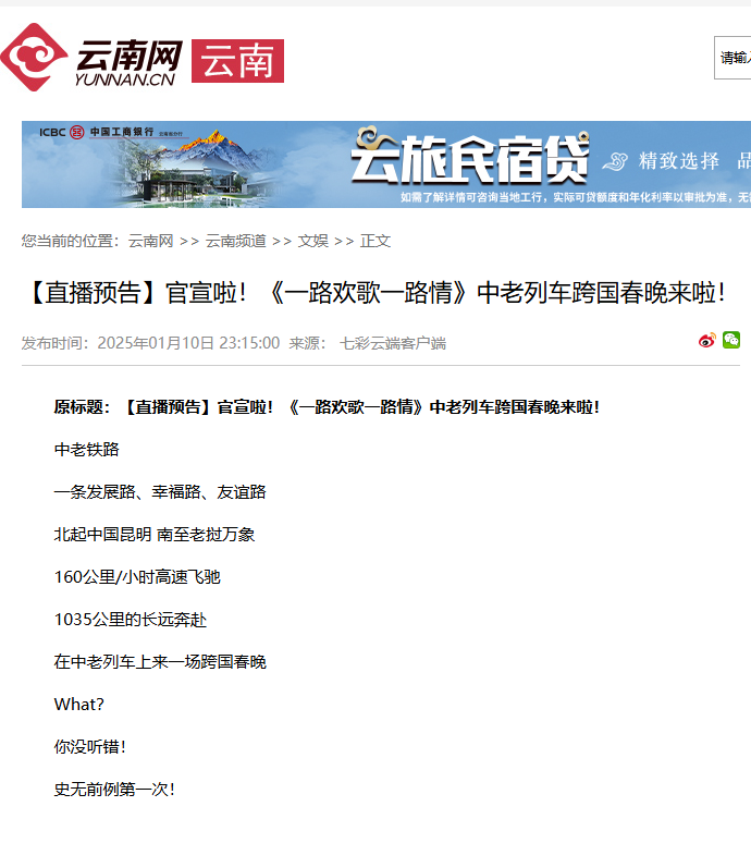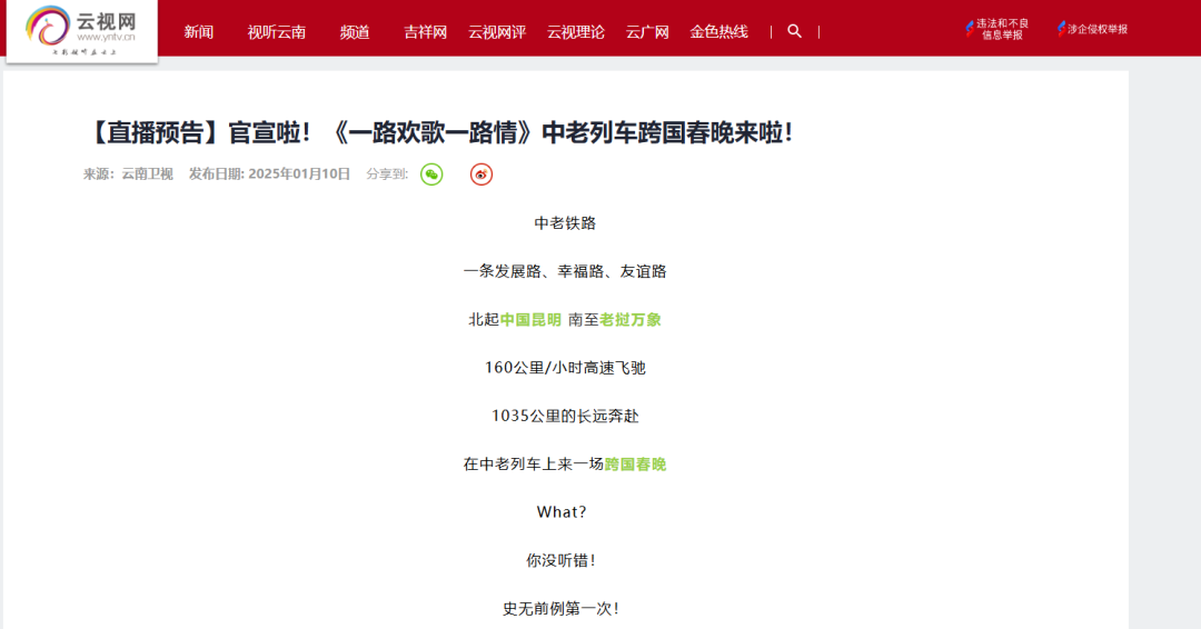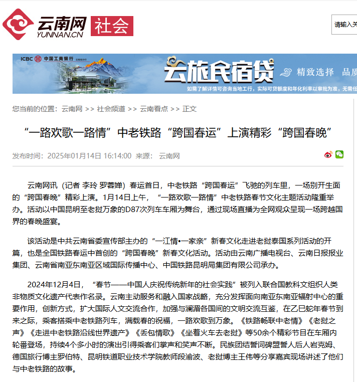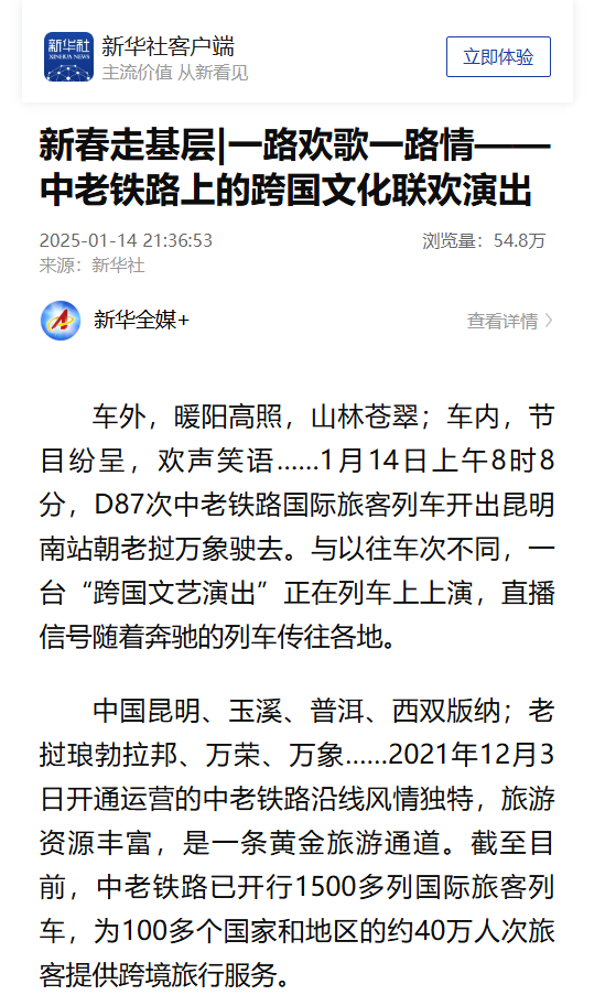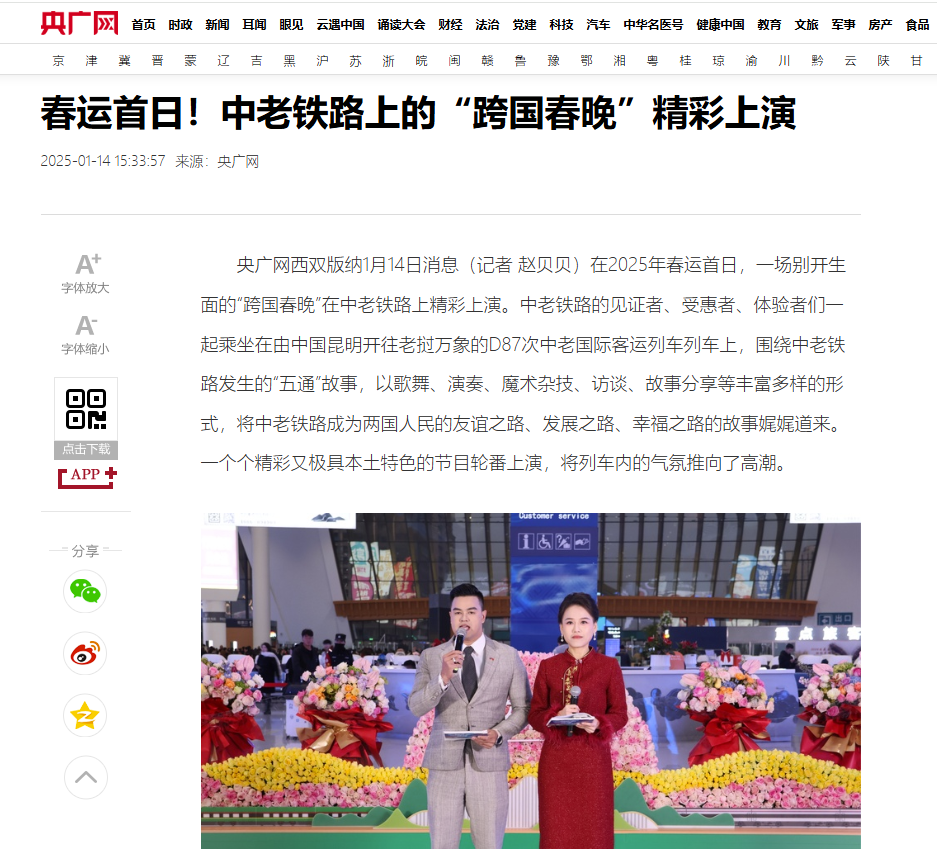 截至2025年1月14日17时,全网关于一路欢歌一路情“跨国春晚”的信息超1700条,累计全网阅读量超2亿次,新浪微博#中老铁路上的跨国春晚#、#一路欢歌一路情#等10余个话题热度突破50万次。