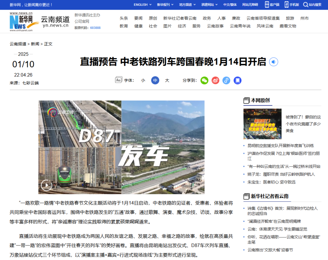 春运首日,中老铁路“跨国春运”飞驰的列车里,一场别开生面的“跨国春晚”精彩上演。1月14日上午,“一路欢歌一路情”中老铁路春节文化主题活动隆重举办。活动以中国昆明至老挝万象的D87次列车车厢为舞台,通过现场直播为全网观众呈现一场跨越国界的春晚盛宴。该活动是中共云南省委宣传部主办的“一江情·一家亲”新春文化走进老挝泰国系列活动的开篇,也是全国铁路春运中首创的“跨国春晚”新春文化活动。