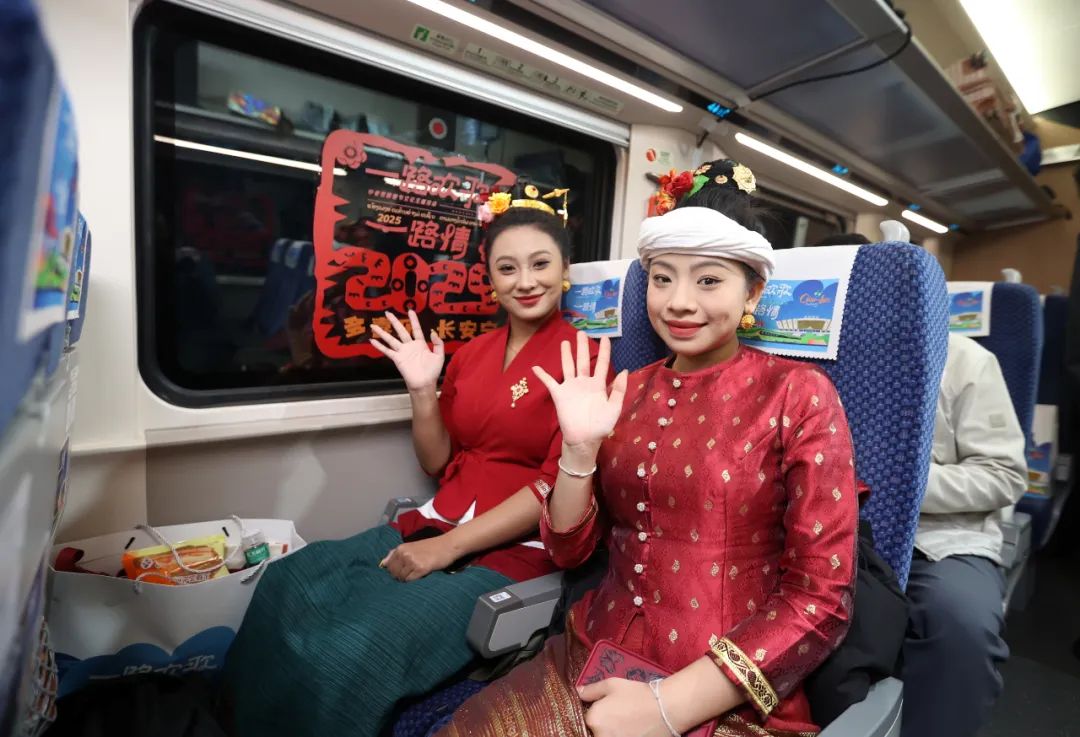 移动舞台沉浸互动,车厢秒变舞台,乘客变身现场观众,精彩表演在行进列车中上演,搭乘国际列车的旅客可借民族歌舞表演《丢包情歌》体验云南民俗,可现场触摸变脸的神秘脸谱,可跟随魔幻“打跳”一起欢歌,深切感受到这不仅是一段欢愉的旅程,更是一场生动可触的中老文化体验。活动邀请中老铁路的建设者、见证者、受益者以及两国文化使者现场分享故事。