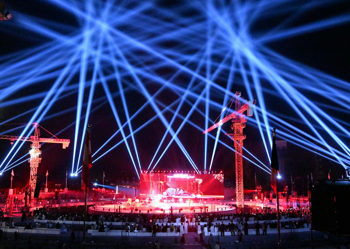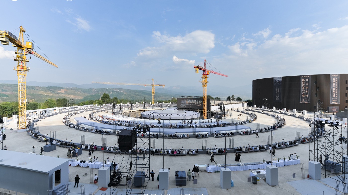 22日傍晚,景迈茶马古窖建设工地临时搭建的舞台中央,来自全国30余个省市区、港澳台地区的200余家茶馆主理人与茶品牌负责人、全球60余个国家爱茶人士共1200多人齐聚18000平方米的圆形平台一起品茶,“景迈山魂·万国茶会”盛会精彩举行。