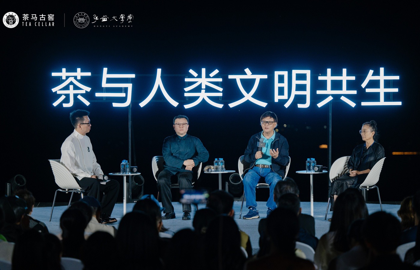 夜幕降临,中国社会科学院哲学所研究员、国际美学协会(IAA)总执委、CCTV《遇鉴文明》特邀专家刘悦笛,江西省社会科学院首席研究员、万里茶道茶学院院长、中国茶文化重点学科带头人余悦,台湾“优人神鼓”创办人刘若瑀,弘益大学堂校长、华茶青年会主席李乐骏等知名美学家、茶学家围坐星穹之下,围绕“茶与人类文明共生”主题,从茶盏涟漪中窥见文明肌理,呼吁回归自然与本真的文明观。