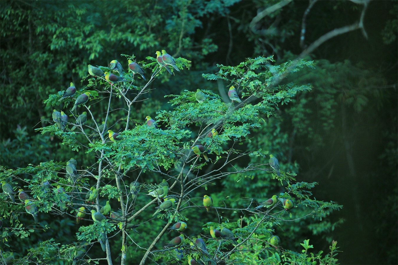 走进“美女池”畔,成群嬉闹的楔尾绿鸠出现在眼前。只见它们时而停歇在池边茂密的树梢,沐浴着温润的水汽;时而在林间轻盈穿梭,清脆的鸣叫声与潺潺的温泉流水声交织成曲。其独特的外形——通体翠绿、尾羽呈明显的楔形,在氤氲雾气与绿树掩映下格外醒目,吸引了众多游客和摄影爱好者驻足观赏、记录下这难得的画面。