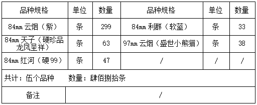 2025年9月19日,我局执法人员在昆明市呈贡区洛羊街道联运大道众盟物流园昆明至腾冲猴桥专线查获卷烟:84mm云烟(紫)299条、84mm天子(硬珍品龙凤呈祥)63条、84mm红河(硬99)47条、84mm利群(软蓝)33条、97mm云烟(盛世小熊猫)38条,共计5个品种480条,并依法予以先行登记保存。