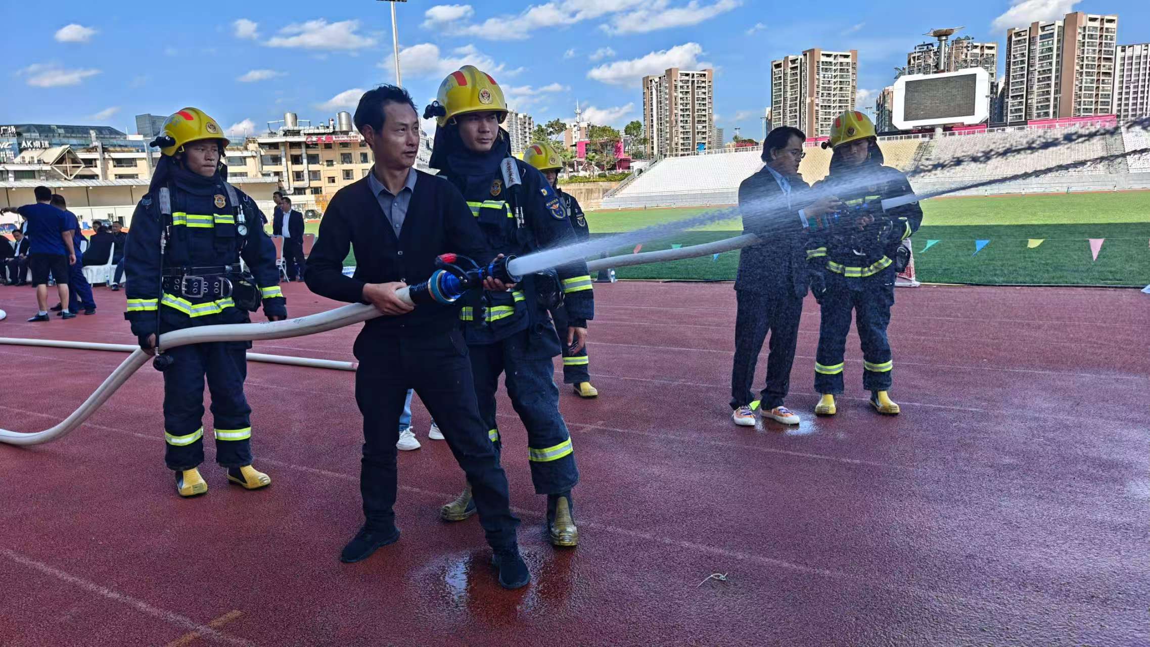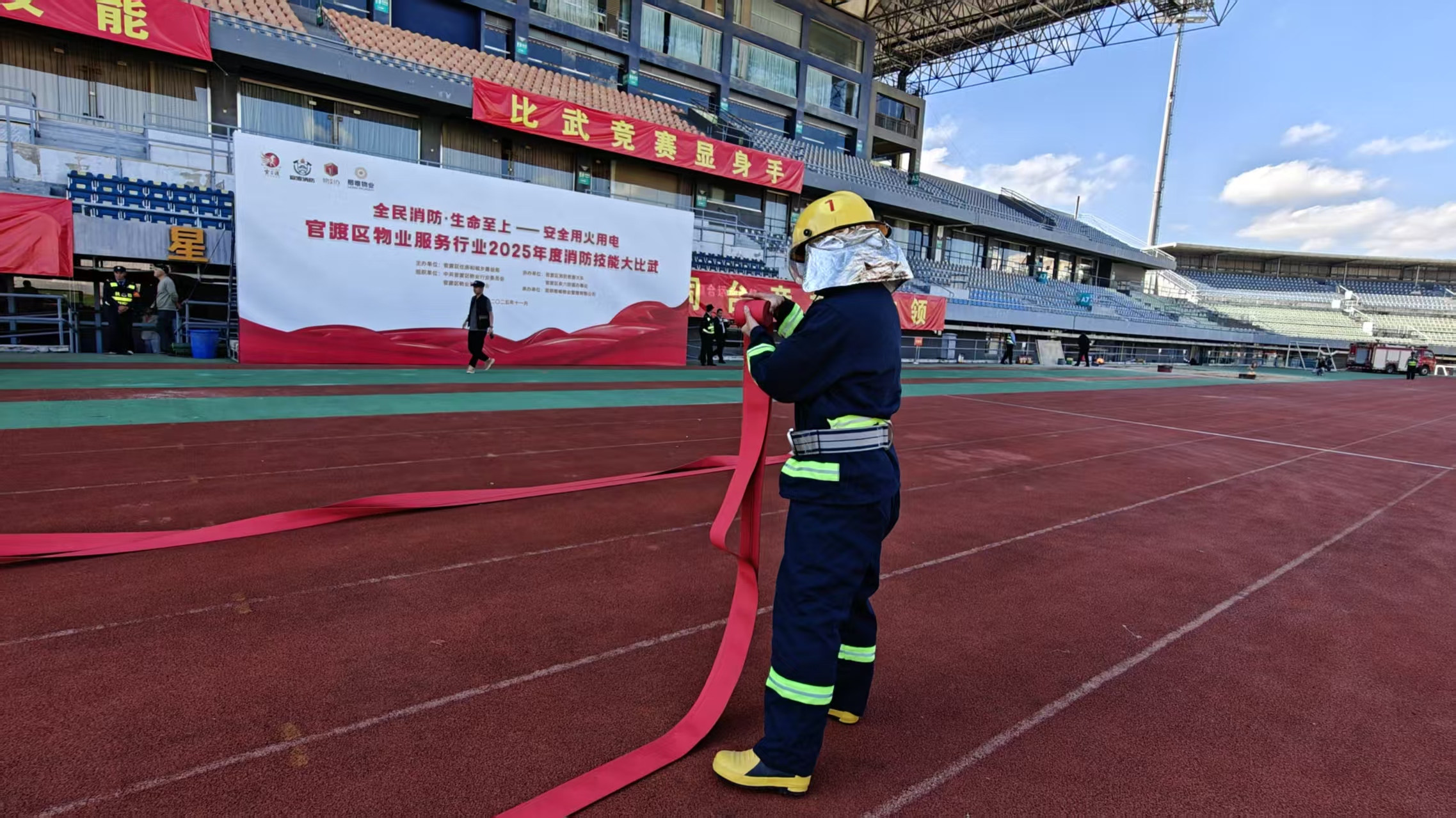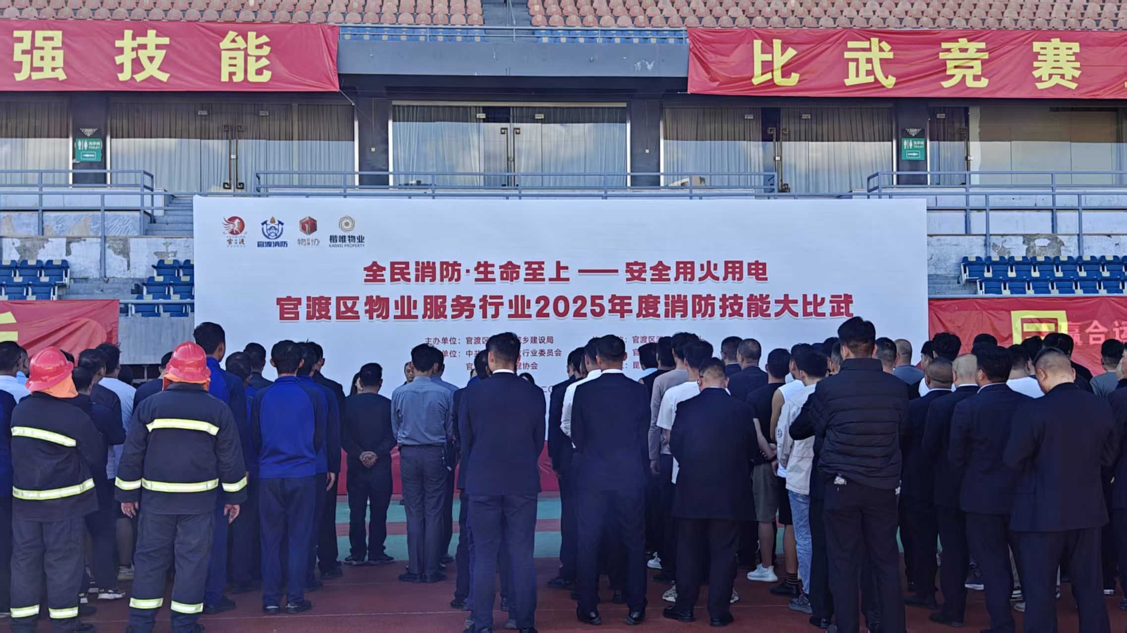 11月11日下午,昆明新亚洲体育城,消防水带在阳光下挥出弧线,灭火器喷出的干粉准确覆盖“火源”,此起彼伏的呐喊与掌声交织成一片——昆明市官渡区物业服务行业2025年“全民消防・生命至上——安全用火用电”消防技能大比武活动在此激烈进行。本次活动由官渡区住房和城乡建设局、矣六街道办、区物业行业党委、区物业管理协会联合主办,并得到官渡区消防应急救援大队、属地派出所及周边社区的全程指导。全区28家物业服务企业的百余名从业人员同台竞技,以实战化比拼检验住宅小区消防安全管理能力。