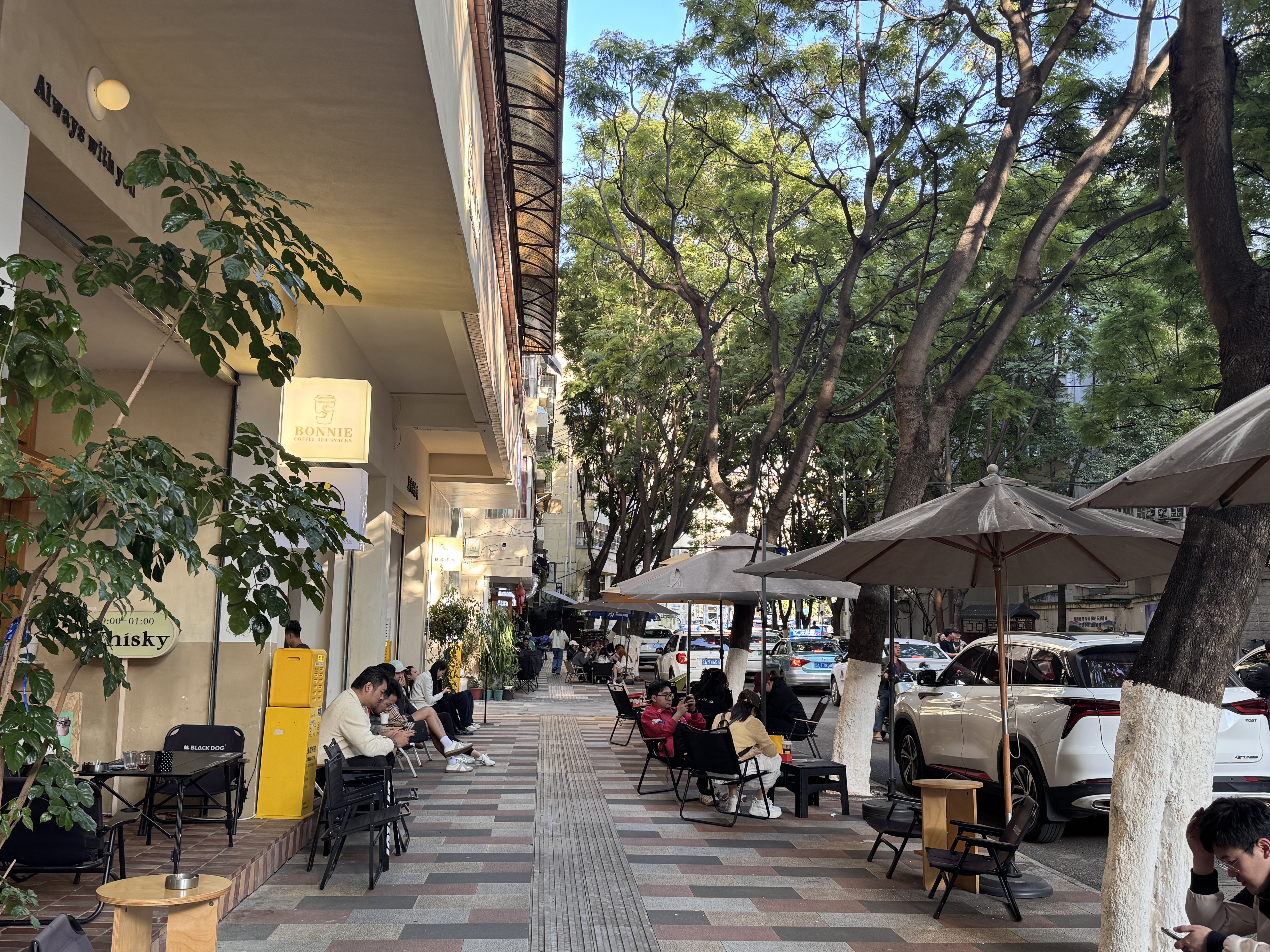 若说街头的留言板、巡津街的打卡墙是昆明“松弛感”的零星体现,那工作日下午满座的咖啡店,便是这座城市悠闲节奏的生动诠释。不同于其他城市咖啡馆常见上班族匆忙办公的景象,昆明的咖啡店,更像是人们享受生活的“休闲空间”。即便在周三这样的工作日,记者在下午走进巡津街的咖啡馆,所见多是这般情景:有人抱着电脑处理工作,但更多人是和朋友围坐畅谈,手里端着咖啡,闲话家常,偶尔抬头看看窗外的街景;还有独自前来的顾客,坐在窗边,一边阅读书籍,一边细品咖啡,阳光透过玻璃洒在桌上,时间仿佛都慢了下来。