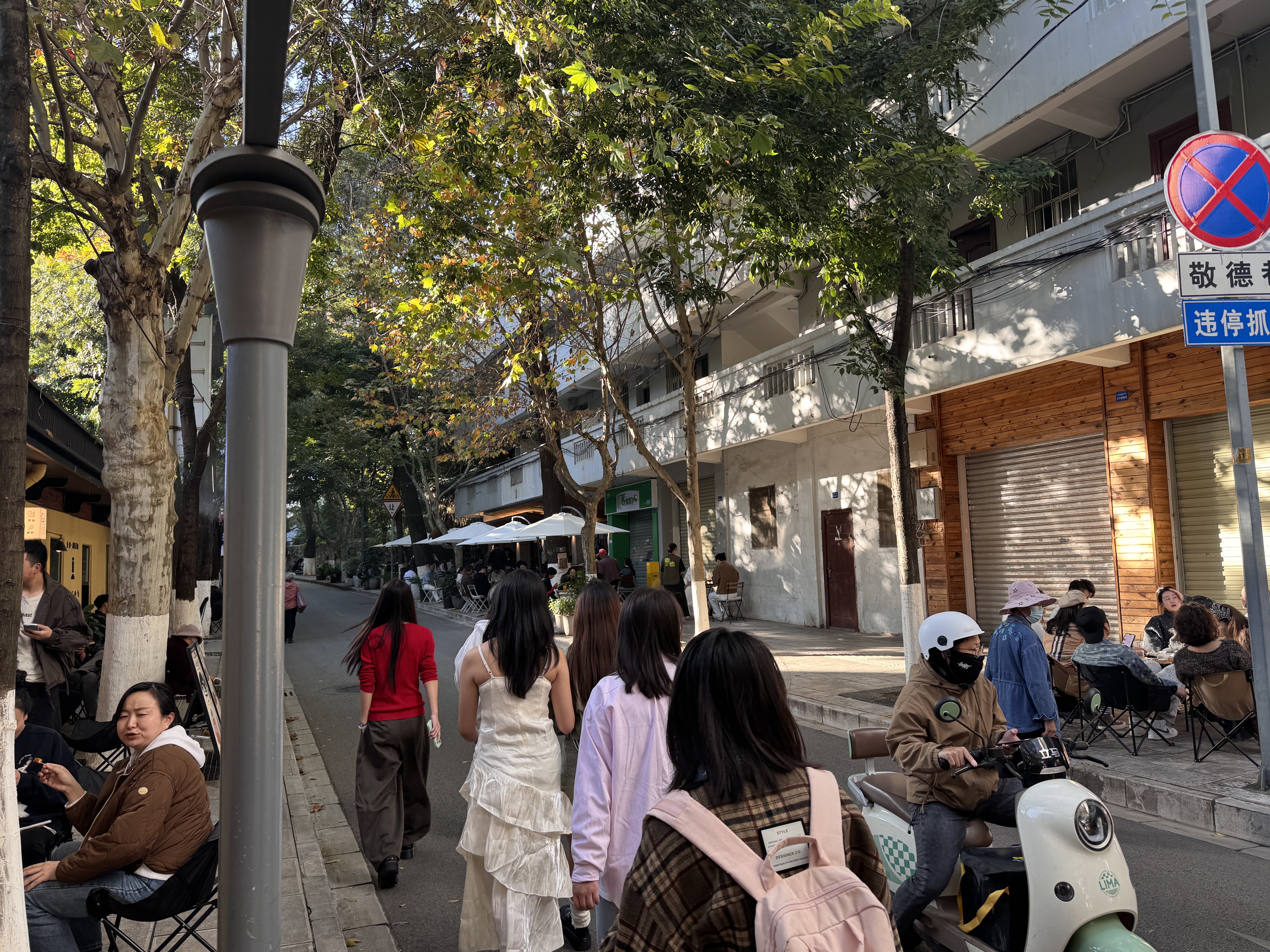 更多生活气息浓郁的场景,可见于小红书等社交平台的用户分享。有网友展示在翠湖所见的店铺:玻璃展示柜里的手写板注明“翠湖跑步,有事电话”;咖啡馆老板会在工作日下午贴出“今日天气好,闭店两小时去爬西山”的通知,全然不担心耽误生意……这些看似随意的告示,却成了昆明人从容生活的最佳写照。除了街头小店的洒脱,昆明的“松弛感”还体现在工作日网红打卡地的人气里。在巡津街,少女手绘墙搭配设计精巧的镜子墙,成为热门的拍照点。记者在12日15时看到不少市民和游客来这里打卡,有人举着手机自拍,还有专业的写真摄影师带着模特前来,场面热闹却不拥挤,大家默契地轮流拍摄,沉浸于这份属于昆明的烟火与浪漫。