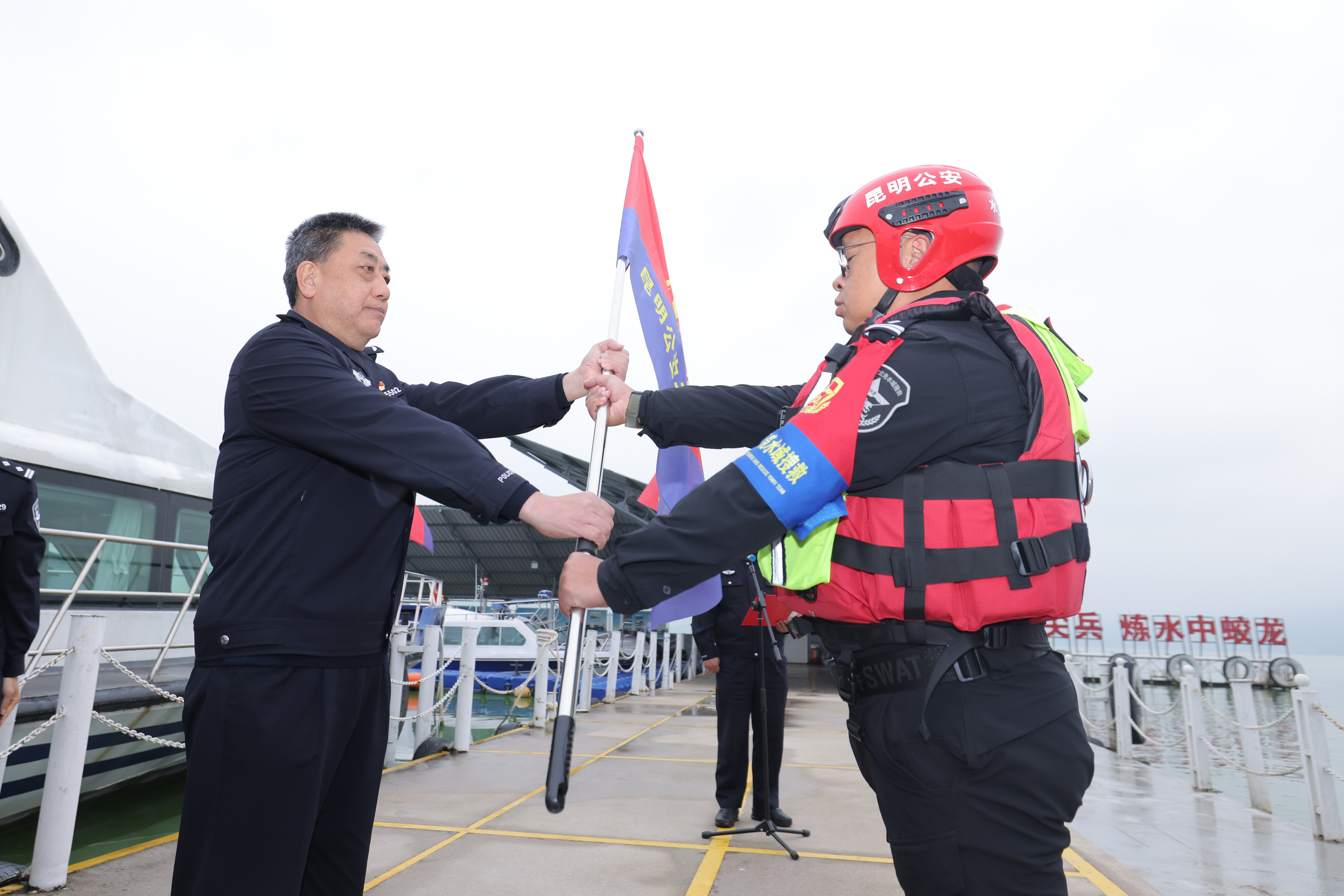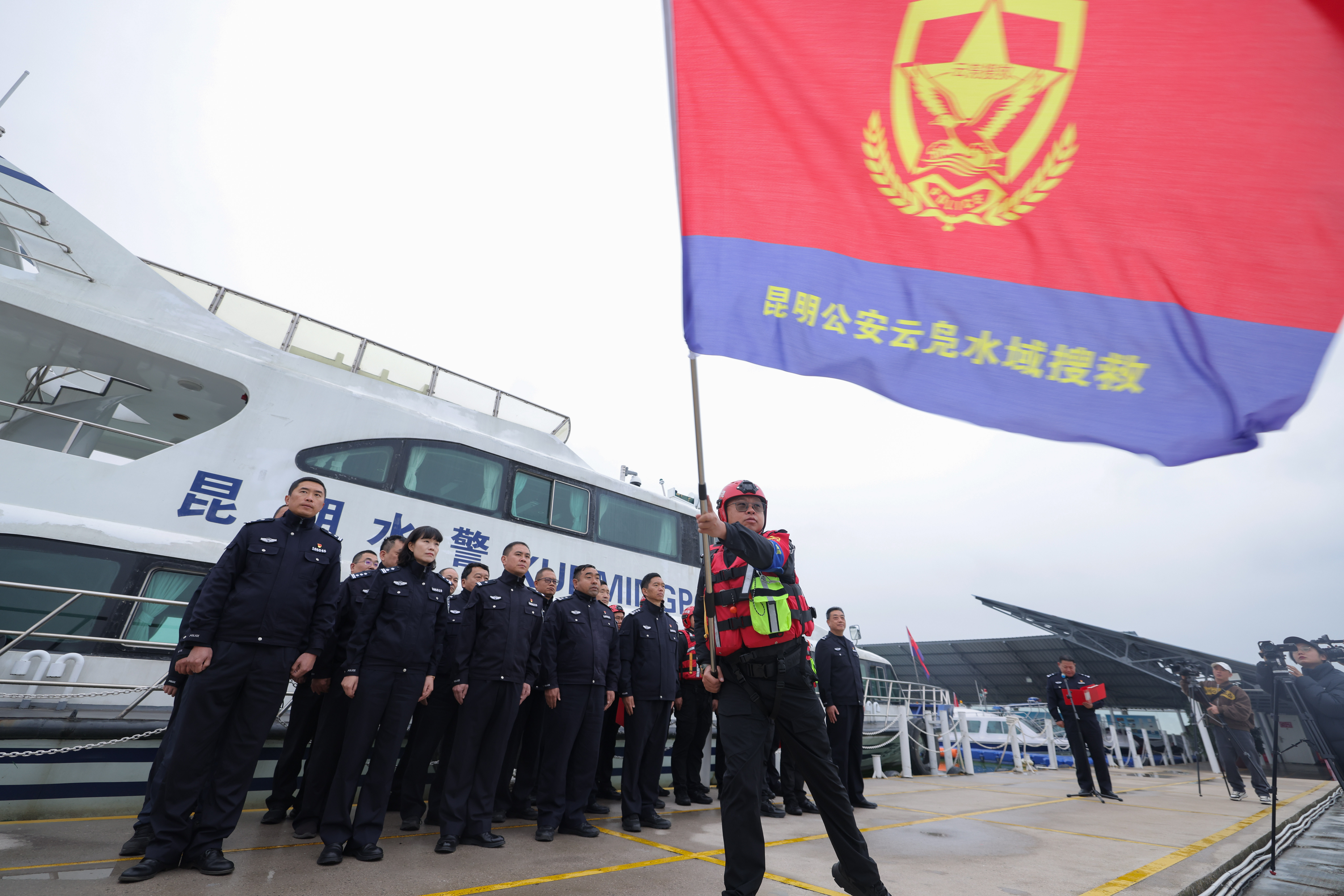 11月20日,昆明市公安局水上治安分局在滇池水上派出所(昆明水警码头)举行 “云凫” 水域搜救队授旗仪式暨实战演练活动,标志着一支专司滇池水域搜救的公安专业队伍正式启航。