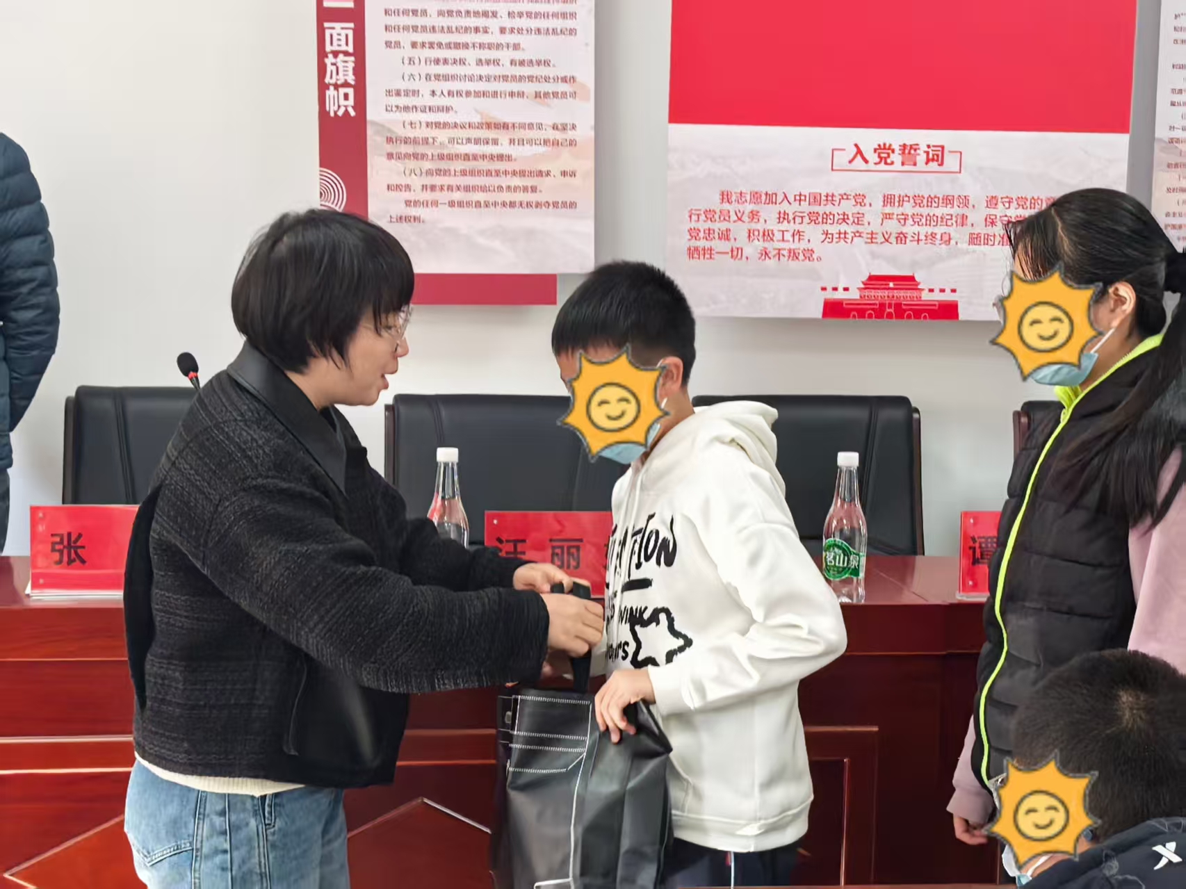 在温馨的氛围中,企业及社区代表亲手将过冬衣物交到学生们手中。孩子们接过这份冬日的礼物,脸上绽放出灿烂的笑容。