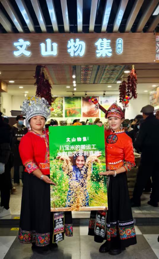 为了此次开业,王永跃带队携村民们将田垄间的“珍宝”带到昆明,用最淳朴的方式,传递文山的风土人情与文化底蕴。这款有着“乾隆御赐贡米”之称的稻米,是文山农耕文化的代表之作。其种植区域集中在广南八宝镇的梯田中,这里独特的地理环境和气候条件,造就了八宝贡米独特的品质。村民们沿用传统种植技艺,精耕细作,不施化肥、不打农药,让稻米在自然环境中自由生长。煮好的八宝贡米饭,米香浓郁、口感软糯,无论是单独食用,还是搭配菜肴,都别具风味。