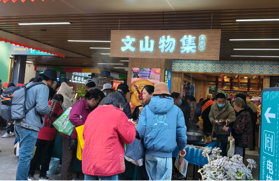 作为昆明最具人气的农贸市场,篆新向来是各地风物的聚集地。“文山物集”此次入驻篆新,不仅带来了广南八宝贡米、高峰牛肉、铁厂腊肉等明星农产品,更将文山非遗技艺与饮食文化搬到了昆明市民面前。据“文山物集”品牌创始人高晓健介绍,品牌始终坚持“溯源、保真、赋能”的经营理念,深入文山各县乡,与当地村民、非遗传承人建立长期合作关系,从源头把控食材品质,确保每一份产品都源自自然、忠于本味,不仅为广大消费者带来舌尖上的美味享受,更提供了沉浸式的文山文化体验,为文旅融合、城乡融合发展写下生动注脚。