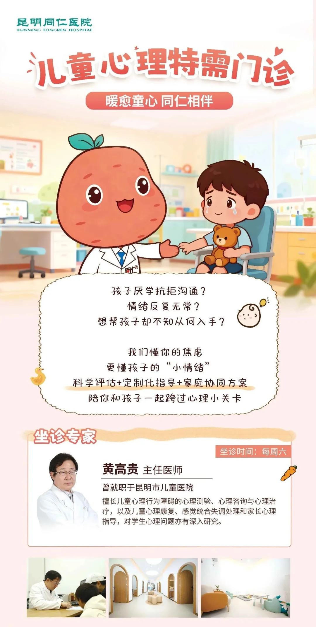 为了更好地呵护儿童及青少年的心理健康,昆明同仁医院新增设儿童心理特需门诊,资深心理专家黄高贵主任将于每周六来院坐诊,与家长和孩子进行面对面深度沟通,为5—18岁儿童及青少年提供心理支持,做孩子成长路上的“心灵伙伴”。