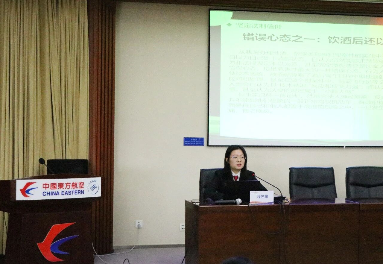 法治是安全的基石,廉洁是飞行的航标。“飞机起飞前需要确认所有系统正常、天气适航、机组状态良好。同样,每一位航空人在工作生活中也必须确认自身状态符合法律及职业要求,远离职业生涯的‘禁航区’。”讲座中,刑事审判庭法官程艺珺围绕“以法为翼、慎行致远”的主题,紧密结合飞行职业特点与实际,基于法院审理的真实案例析理明规、以案释法,剖析犯罪心理和错误心态,引导飞行人员及航空从业人员深刻认识廉洁自律、抵制不良诱惑的重要性,特别是清醒认识酒驾醉驾、黄赌毒等违法违纪行为对个人、家庭、职业及社会造成的极端危害,进一步筑牢思想防线,增强行为自觉,推动营造风清气正、遵纪守法的职业环境。