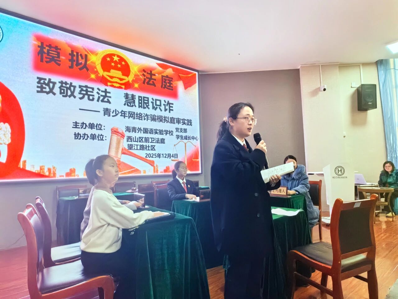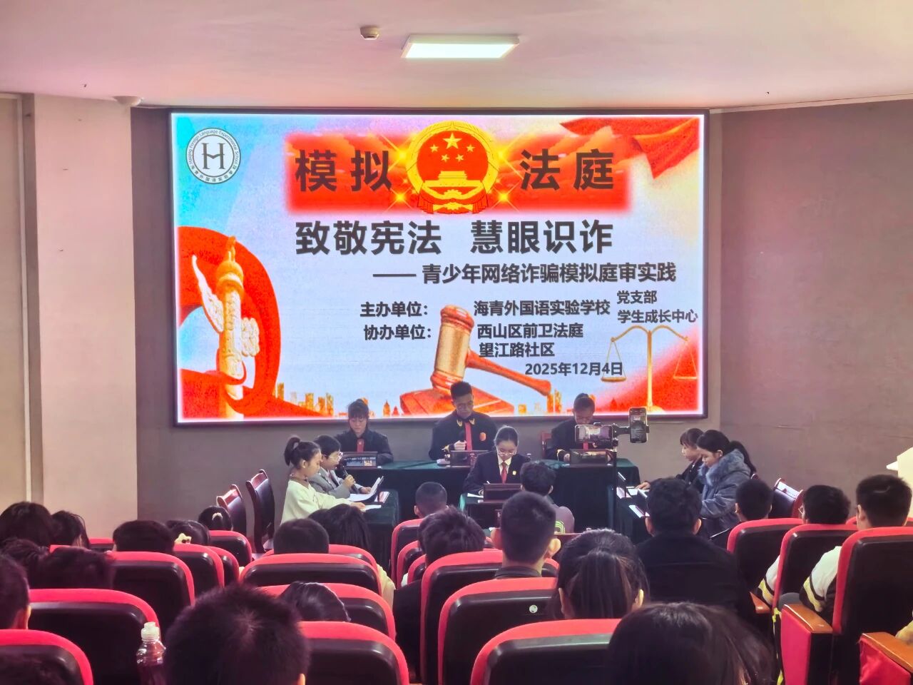 在第12个国家宪法日到来之际,为弘扬宪法精神,增强青少年法治意识和自我保护能力,昆明市西山区人民法院前卫法庭联合海青外国语实验学校,共同举办了一场主题为“致敬宪法,慧眼识诈”的模拟法庭进校园活动,将宪法宣传与防范电信网络诈骗教育深度融合,为同学们送去了一堂别开生面、印象深刻的法治实践课。