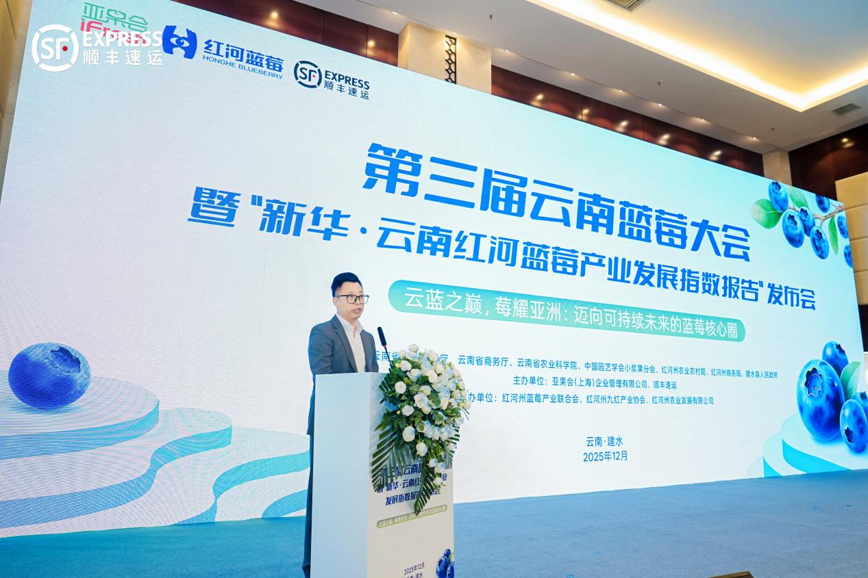 12月20日,第三届云南蓝莓大会在云南建水隆重举行。顺丰集团特色经济项目部副总经理郭翔兵出席大会并致辞,同时顺丰在大会上正式发布了最新的《蓝莓物流解决方案》,系统展示了其在蓝莓全链路物流服务中的创新实践与前瞻布局。
