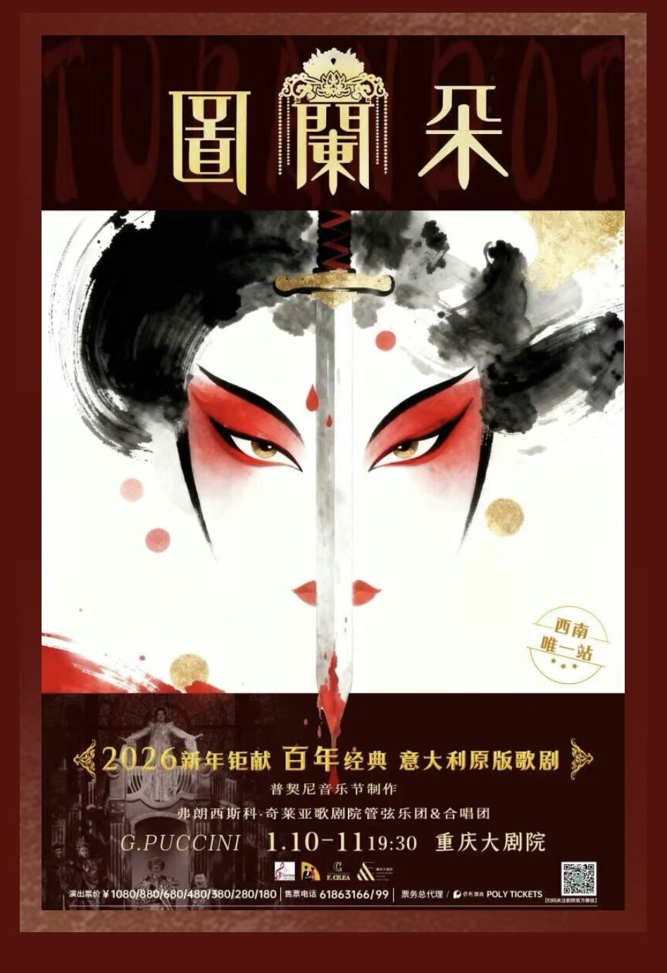 烫一锅麻辣火锅,钻进8D立体迷宫,再听一场原汁原味的意大利歌剧——这个新年,一场跨越百年的文化盛宴正将渝川云贵陕五省市的艺术爱好者汇聚于山城重庆。2026年1月10日至11日,意大利原版歌剧《图兰朵》将在重庆大剧院连演两场。作为普契尼生前最后的作品,该剧自1926年在米兰斯卡拉歌剧院首演以来,已风靡全球近百年。此次演出不仅是本次中国巡演的“西南唯一站”,更特别策划了“五省(市)联动·观剧团”活动,面向云南、四川、贵州、陕西及重庆本地观众发出邀请。