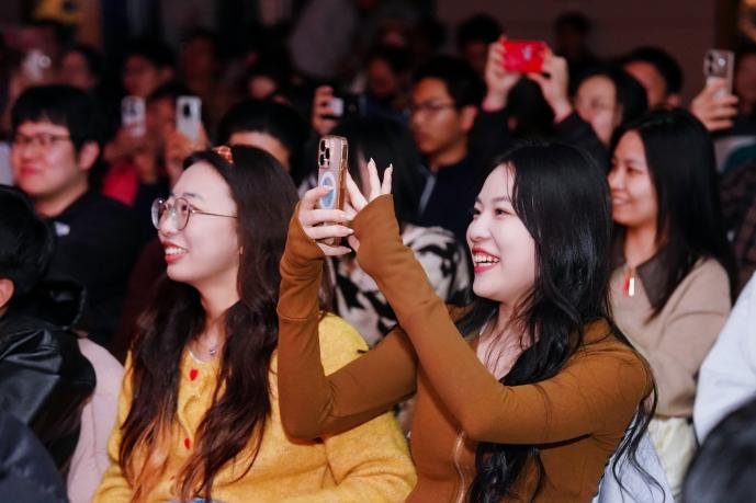 《喜剧之王单口季2》里视角生猛而令人印象深刻的边疆少年真勇,喜剧联合国第二季上海滩脱口秀争霸赛亚军、上海先锋女性播客《双响炮》主播小橘,《喜剧之王单口季》卡司贤鱼,《令人心动的offer7》实习生葵葵,还有《脱口秀大会》卡司、资深喜剧打工人王俊霖等轮番登场,密集输出新潮热梗。一个半小时的演出里,整个酒店剧场如同一个充满笑料的盒子,笑声与掌声此起彼伏。