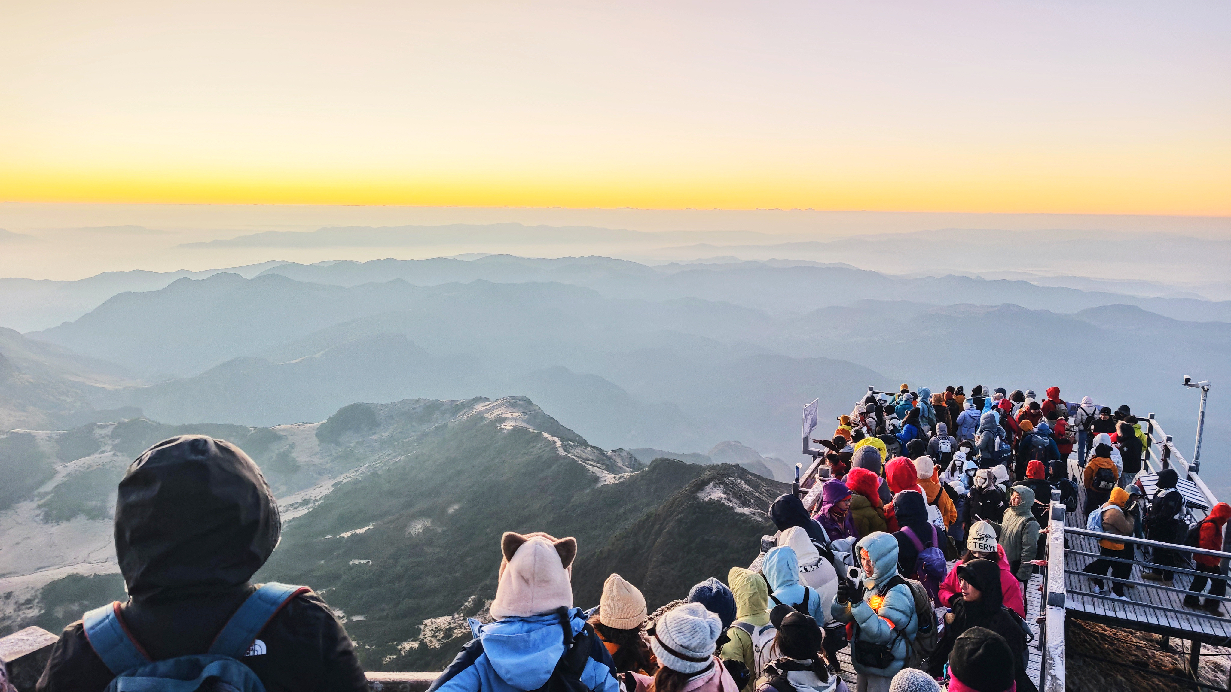 活动当晚,轿子山笼罩在静谧的夜色之中,星河璀璨。千名参与者头灯闪烁,沿山道蜿蜒而上,宛若一条跃动的光之河流,向山顶缓缓行进。经过近三个小时的攀登,大部队于日出前相继抵达山顶。天色渐明,天际泛起橙蓝交融的朝霞,一轮红日冉冉升起,照亮了2026年的第一个清晨,也映亮了现场每一位守望者的脸庞。