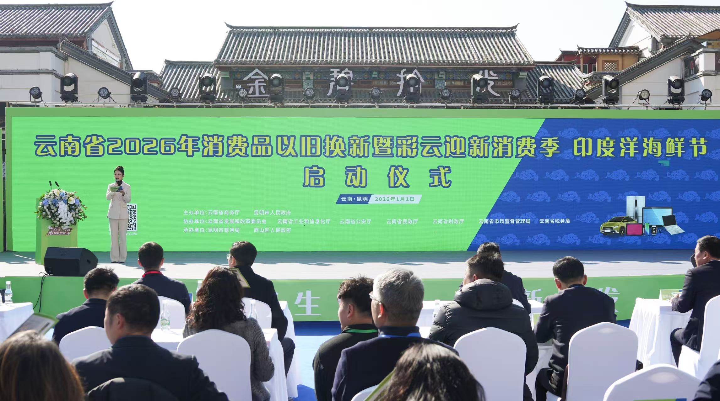 1月1日上午,云南省2026年消费品以旧换新暨彩云迎新消费季、印度洋海鲜节在昆明市西山区金马碧鸡坊商业街正式启动。
