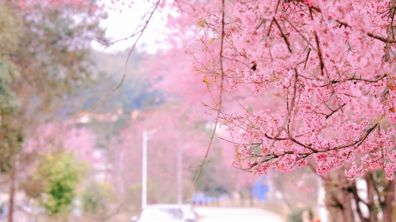 道路旁的樱花树错落有致