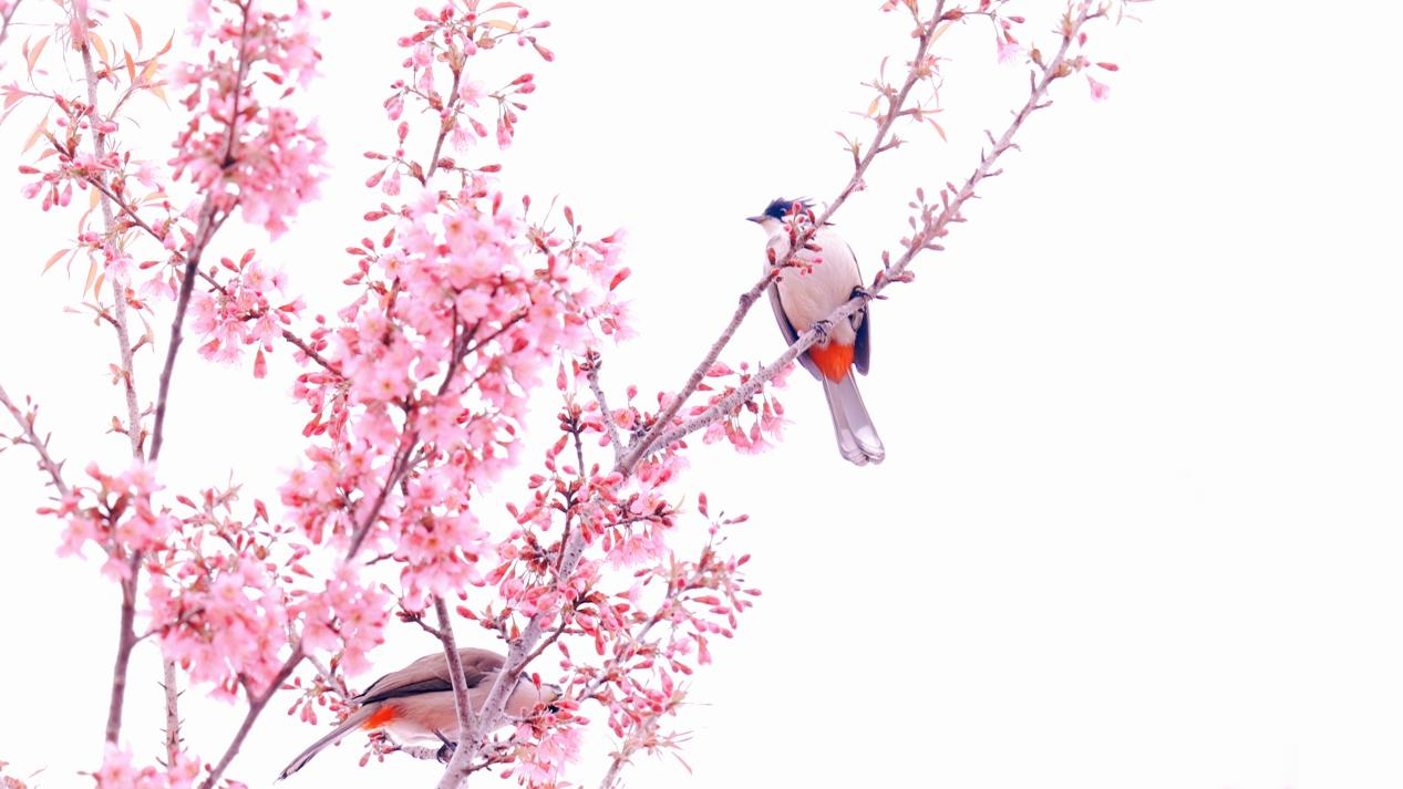 或轻啄花苞,或梳理羽毛