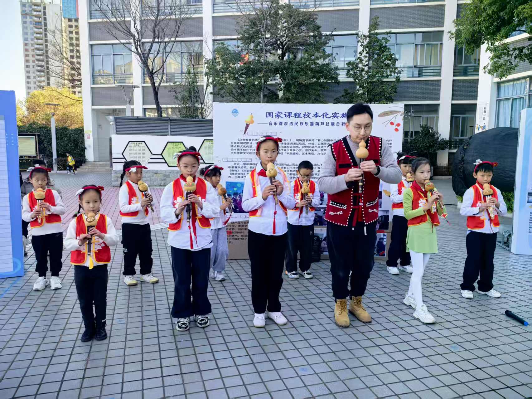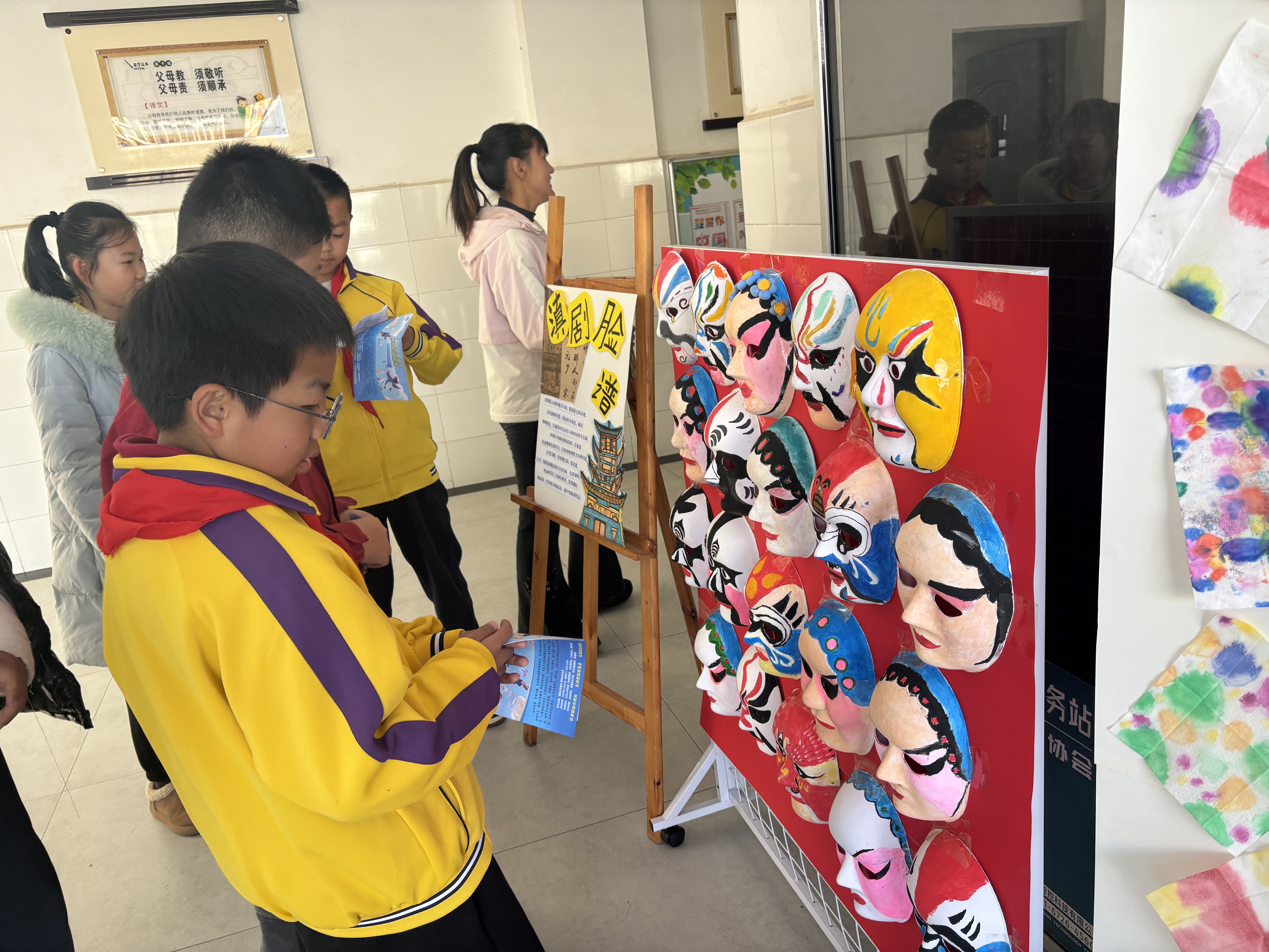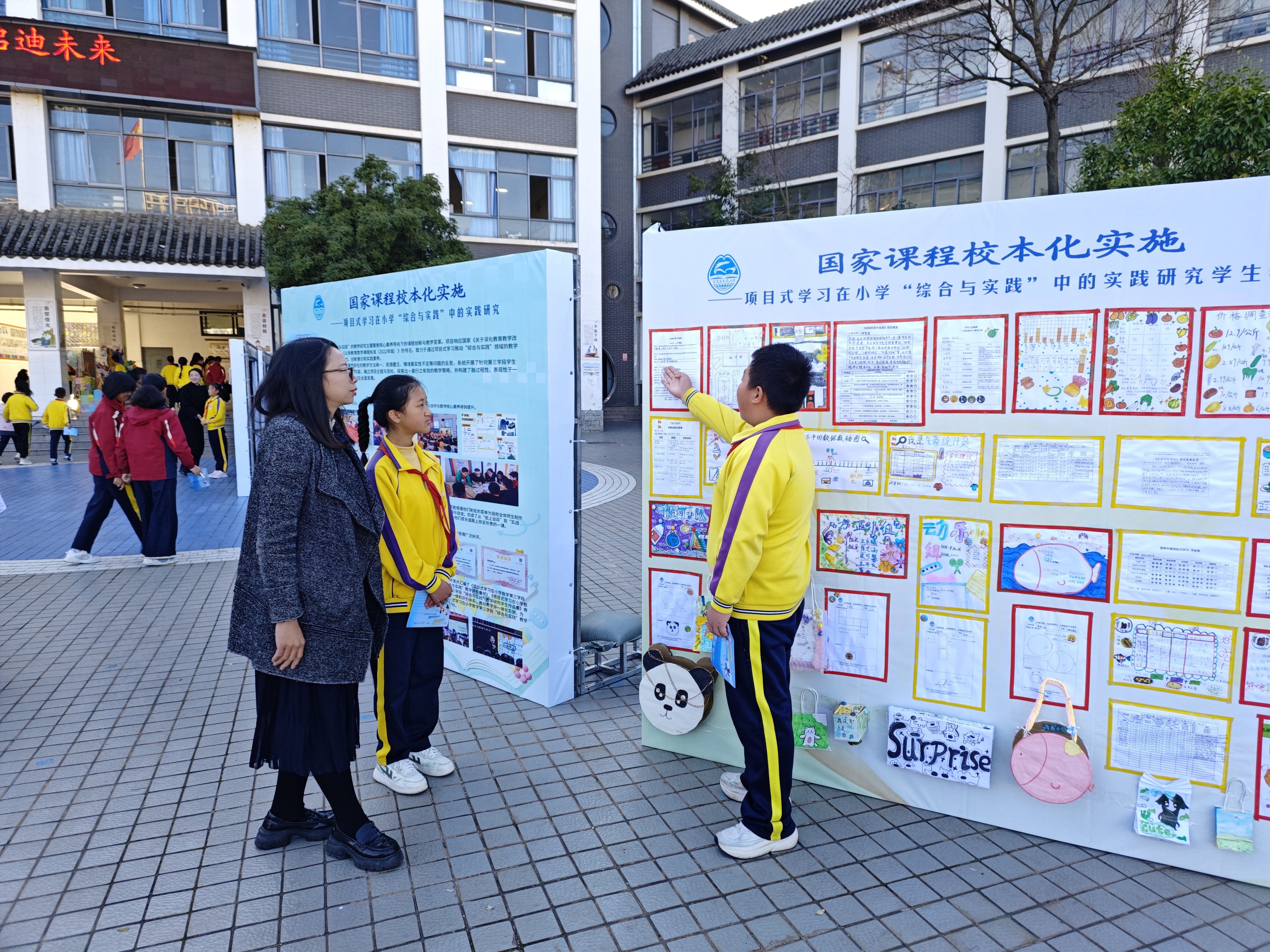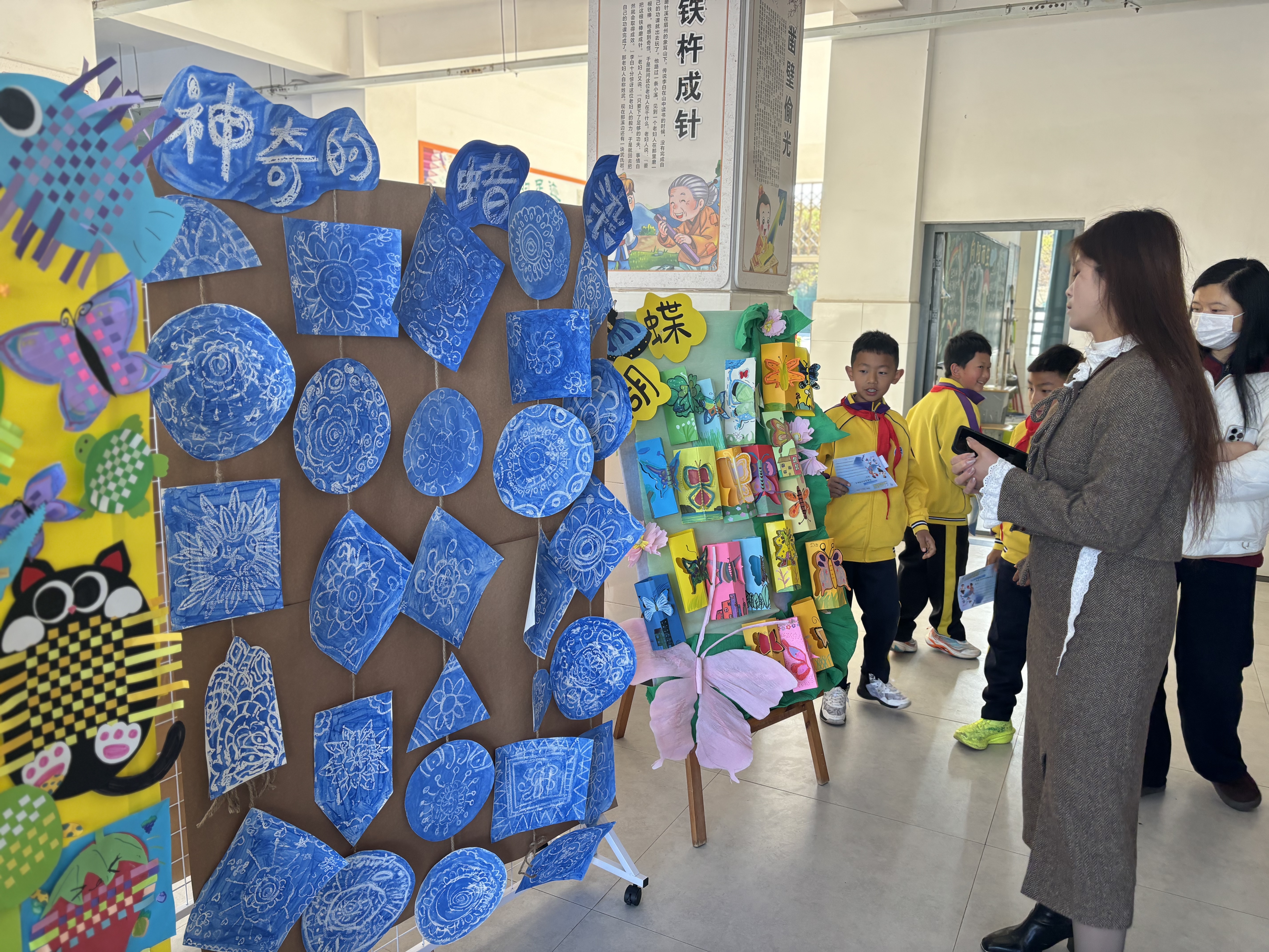 活动丰富多彩,引人入胜。视频展播区循环播放学校课程建设总体宣传片、各特色课程活动精彩集锦及学生课程学习感言短视频,动态呈现了学校课程文化的脉络与温度。校级课程展示区亮点纷呈,体育走班课程、劳动与数学项目式实施成果通过展板清晰呈现;四年级学生带来的葫芦丝合奏《阳光彩虹小白马》旋律悠扬,赢得阵阵掌声;一至六年级“快乐读书吧”推荐书目成果与“红色经典+科技阅读”主题展,彰显了阅读融合的底蕴;蜡染、脸谱、瓦猫、皮影等美术特色作品及一年级综合实践作品,展现了学生的创造力与动手能力,体现了学科融合与素养培育的深度。