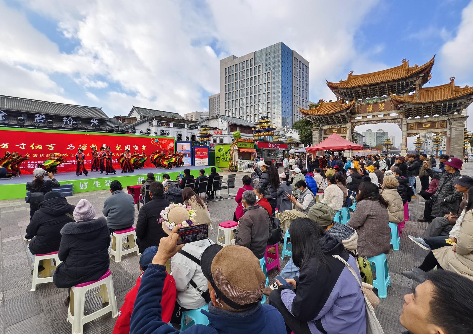 元旦启新程,新春踏歌来。1月5日上午,昆明金马碧鸡广场锣鼓喧天、暖意融融,金碧街道“方寸纳吉·马踏新春·梨园贺岁”2026年迎新春文化惠民活动热闹开演。活动以邮票文化为引、民族演艺为核、非遗互动为翼,为辖区群众与游客献上一场集观赏性、互动性、趣味性于一体的新春文化盛宴。