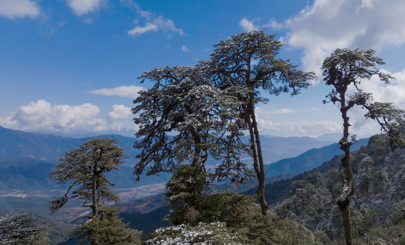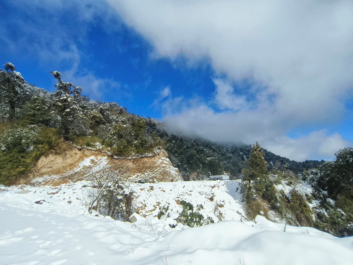 当天,雪花选择了东经98°32′、北纬25°54′这个坐标,在青草岭怯生生地吻上墨绿的冷杉针叶。这场初雪起初静默无声,唯有肌肤感知一丝转瞬即逝的凉意,随后便星星点点密集起来,最终纷扬成一场静谧的典礼。
