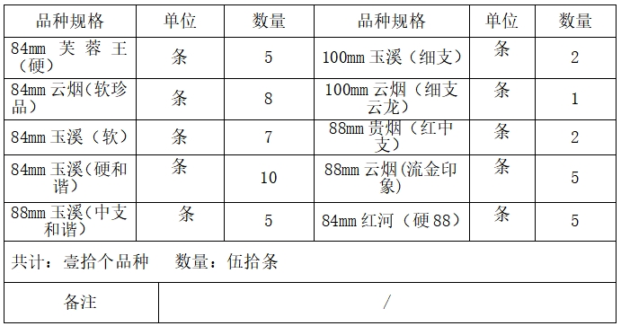 2026年1月5日,我局执法人员在昆明市呈贡区彩龙街强顺物流园3栋9-10号老挝通泰海陆空国际物流查获卷烟:84mm利群(软长嘴)10条、84mm红河(硬88)5条、84mm玉溪(硬和谐)12条、88mm云烟(中支大重九)5条、84mm云烟(紫)15条、100mm云烟(细支珍品)10条、84mm中华(硬)23条、84mm云烟(软珍品)20条、88mm云烟(黑金刚印象新)2条、88mm云烟(黑金刚印象老)3条、88mm玉溪(鑫中支)6条、100mm娇子(X)10条、88mm玉溪(中支和谐)9条,共计壹拾三个品种壹佰叁拾条,并依法予以先行登记保存。
