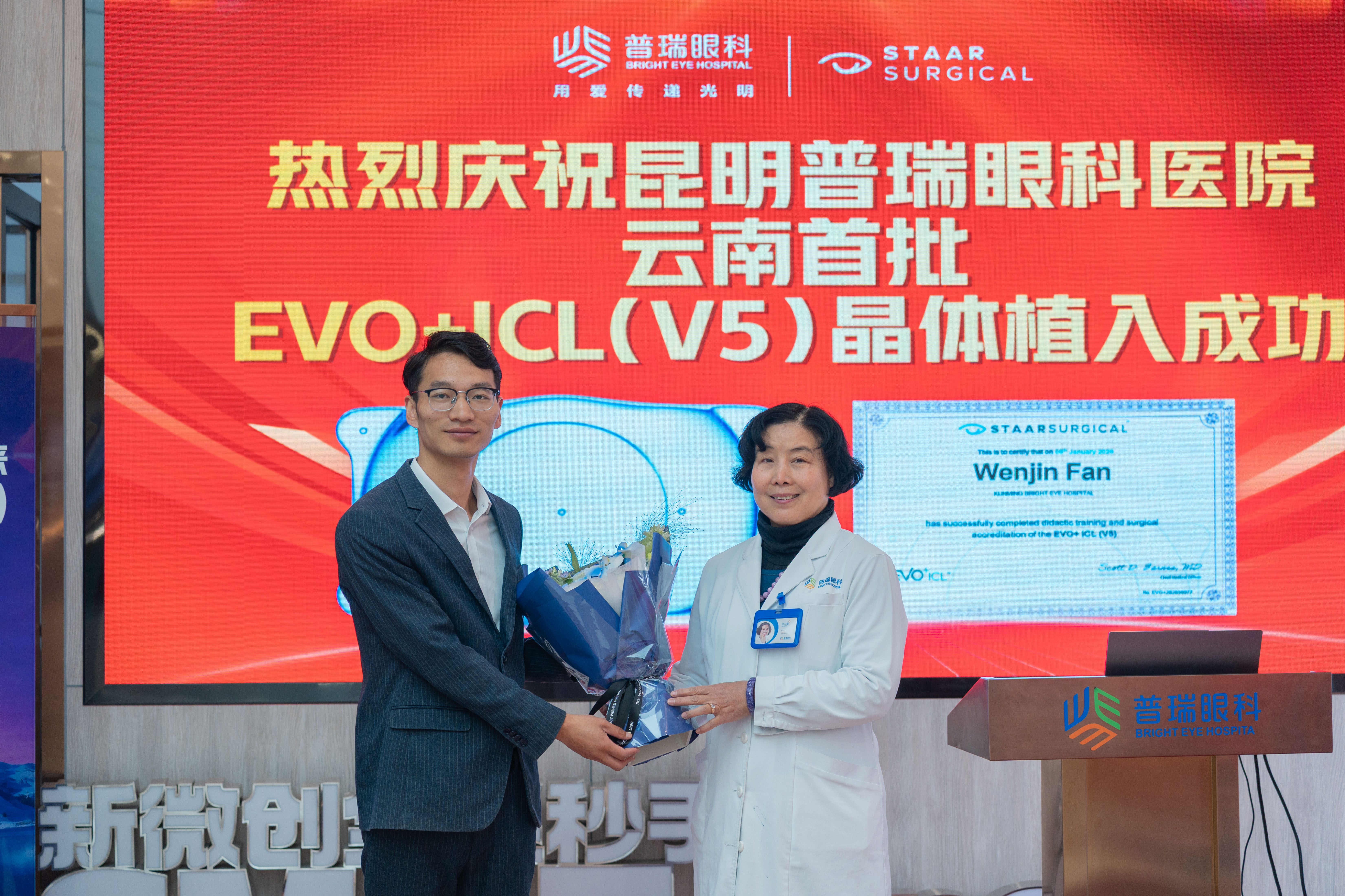 2026 年 1 月 6 日,云南省首批 EVO+ ICL(V5)有晶状体眼人工晶状体植入术在昆明普瑞眼科医院圆满完成。该手术由拥有超万例 ICL 植入手术经验的昆明普瑞眼科医院业务副院长范文瑾成功实施。这一突破,不仅是该前沿技术在云南省正式进入临床应用的重要标志,也意味着省内屈光矫正技术迈入了与国际先进水平同步发展的新阶段。作为云南省 EVO+ ICL(V5)首批临床合作中心之一,此次手术的成功落地,标志着云南高度近视矫正技术正式迈入“高清夜视” 新时代,为区域内近视人群提供了更优质的矫正选择。