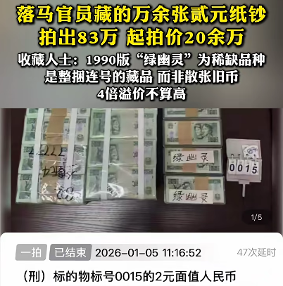 一位已从事12年钱币收藏的人士向记者表示,溢价4倍看似不低,但细算下来单张人民币均价不到80元,“要知道1980版2元全品单张市场价早超90元”,1990版“绿幽灵”更是稀缺品种,整捆密封的收藏价值本就更高,单张面值应该在50倍溢价左右,这成交价其实不算很高。这位人士强调,有人觉得溢价4倍已经很高,“但别忘了这是整捆连号的藏品,而非散张旧币”,他个人认为以成交价来看,拍得者还是“赚到了”。