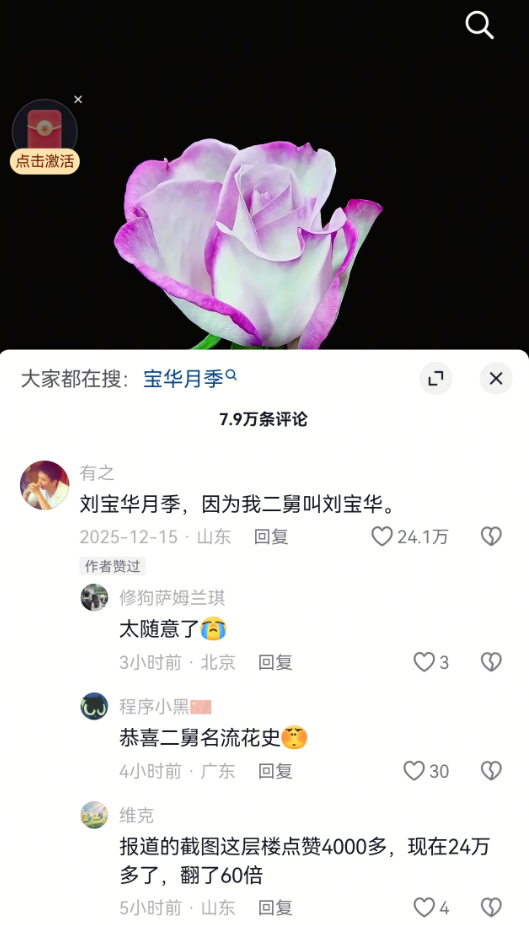 “宝华月季”的故事还没有大结局。博主“植物眼”透露,评论区中很多网友给出的名字都是来源于与自己亲近的长辈——