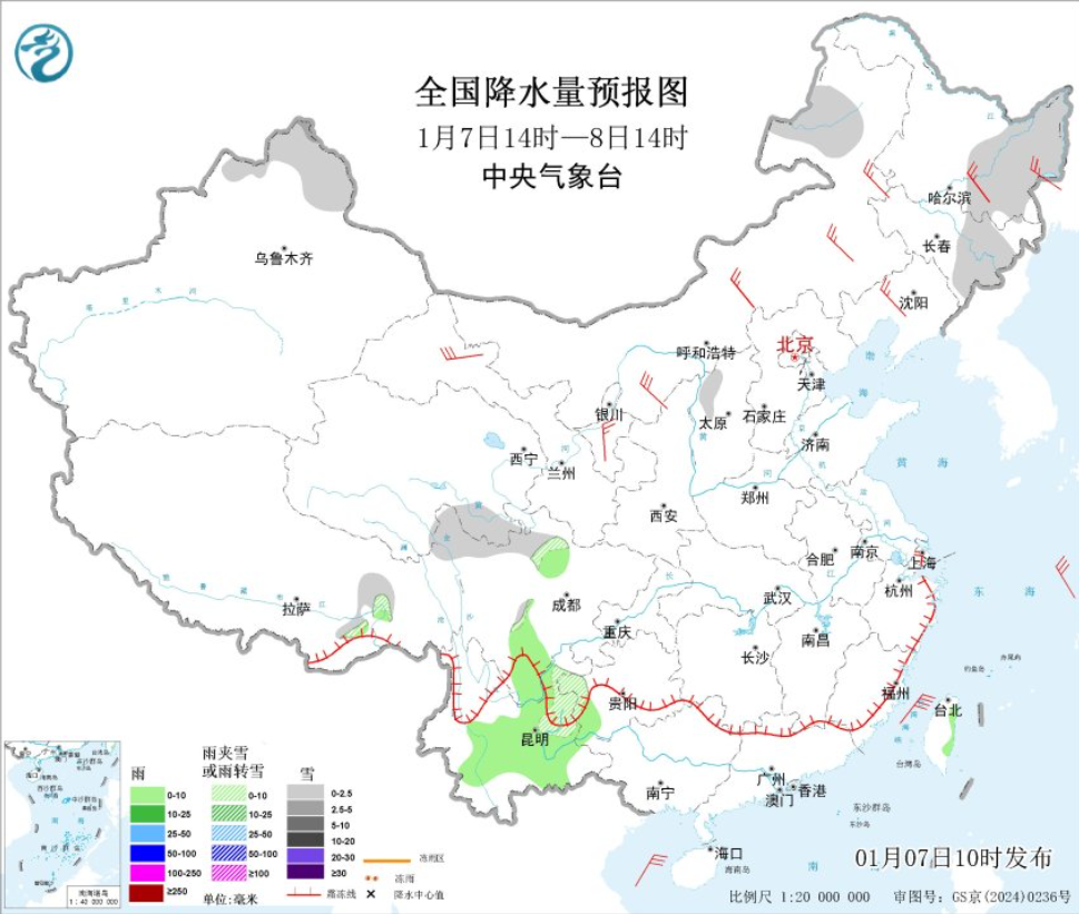 记者从中央气象台了解到,1月7日14时至8日14时,全国降水量预报图显示,此次降水“主战场”集中在云南。放眼全国气温版图,虽然我国西南地区整体气温高于北方,但云南气温相较之前还是显得寒冷异常,其中云南省部分地区呈现出“冰火两重天”的景象:7日白天,景洪、孟连、镇康三地依旧暖意融融,最高气温突破20℃;而昆明市主城区,清晨一场“透心凉”的小雨洒落,当日最高气温仅5.7℃,最低气温低至2.6℃,寒意刺骨。
