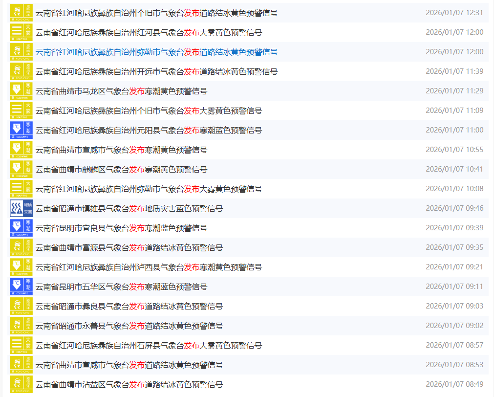 面对强降温,云南各级气象部门迅速响应,密集发布各类预警信号“拉响警报”。1月7日8时至12时短短4小时内,各级气象部门累计发布16条道路结冰预警,其中以黄色预警为主,个旧、曲靖、开远、昭通等多地纳入预警范围;同时发布7条寒潮蓝色预警,预警区域气温将跌破5℃。雨雪、大雾、霜冻“组团”来袭,给云南民众的出行和日常生活蒙上了一层寒意。