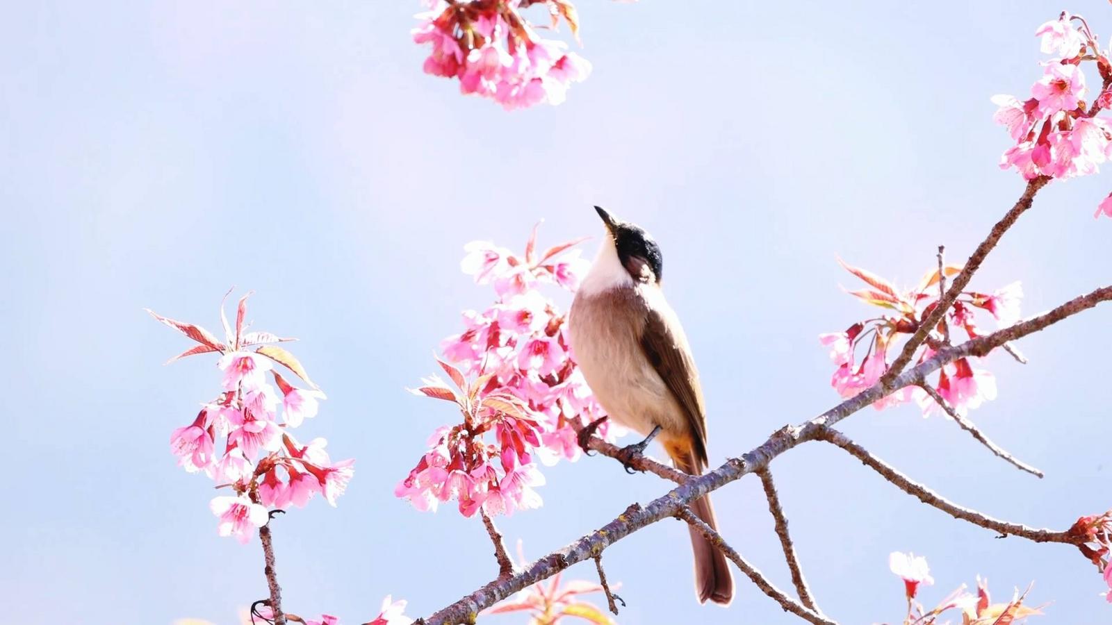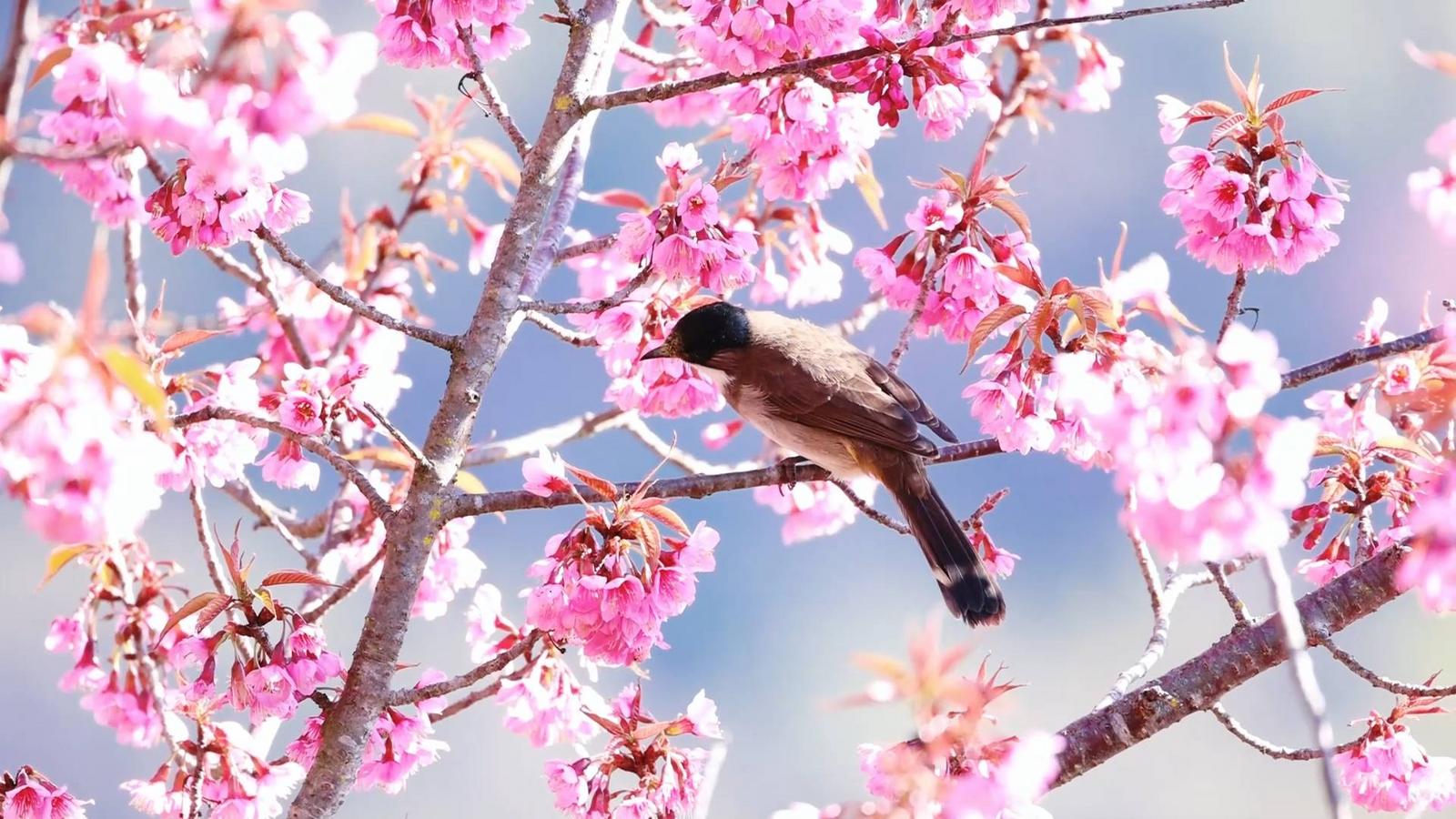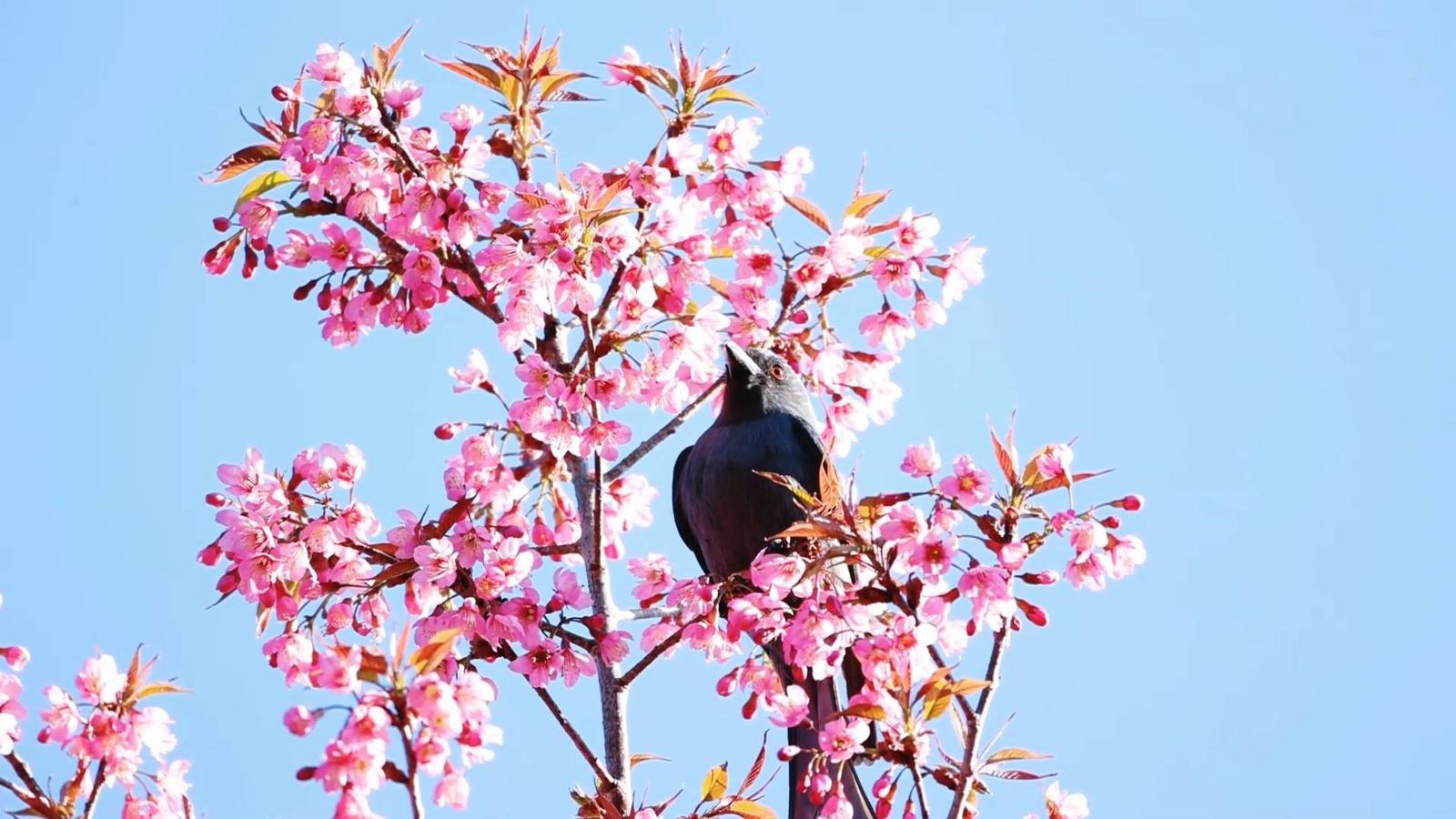 樱花林中,鸟语不绝于耳。各类鸟儿穿梭于花枝间,时而掠过花丛,时而啄食花蜜,时而隐入林间,与摇曳的樱影勾勒出一幅生机盎然的生态画卷。山峰如黛、云朵如絮、樱花如霞,这般美景让前来赏花的游客纷纷驻足,拍照留念,记录下这冬日里的绚烂。