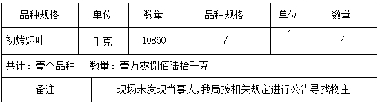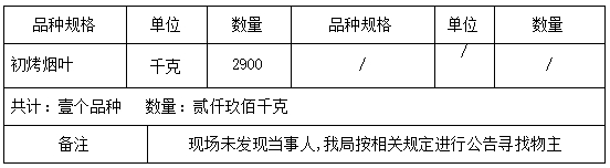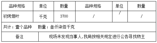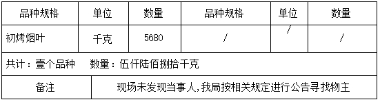 请物主自公告发布之日起60日内到昆明市禄劝县烟草专卖局(地址:昆明市禄劝县掌鸠河南北路;联系人:蒋清龙;联系电话:0871-68911071)接受调查处理。若逾期不来接受调查处理,我局将依据《烟草专卖行政处罚程序规定》第七十三条及有关法律法规的规定,依法对涉案烟草专卖品作出处理。