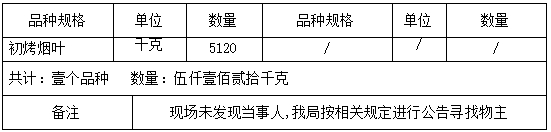 2025年5月16日,我局执法人员在昆明市禄劝县禄大路三岔箐公安检查站内一辆车牌号为川W19D74的车上查获初烤烟叶5120千克,并依法予以先行登记保存。