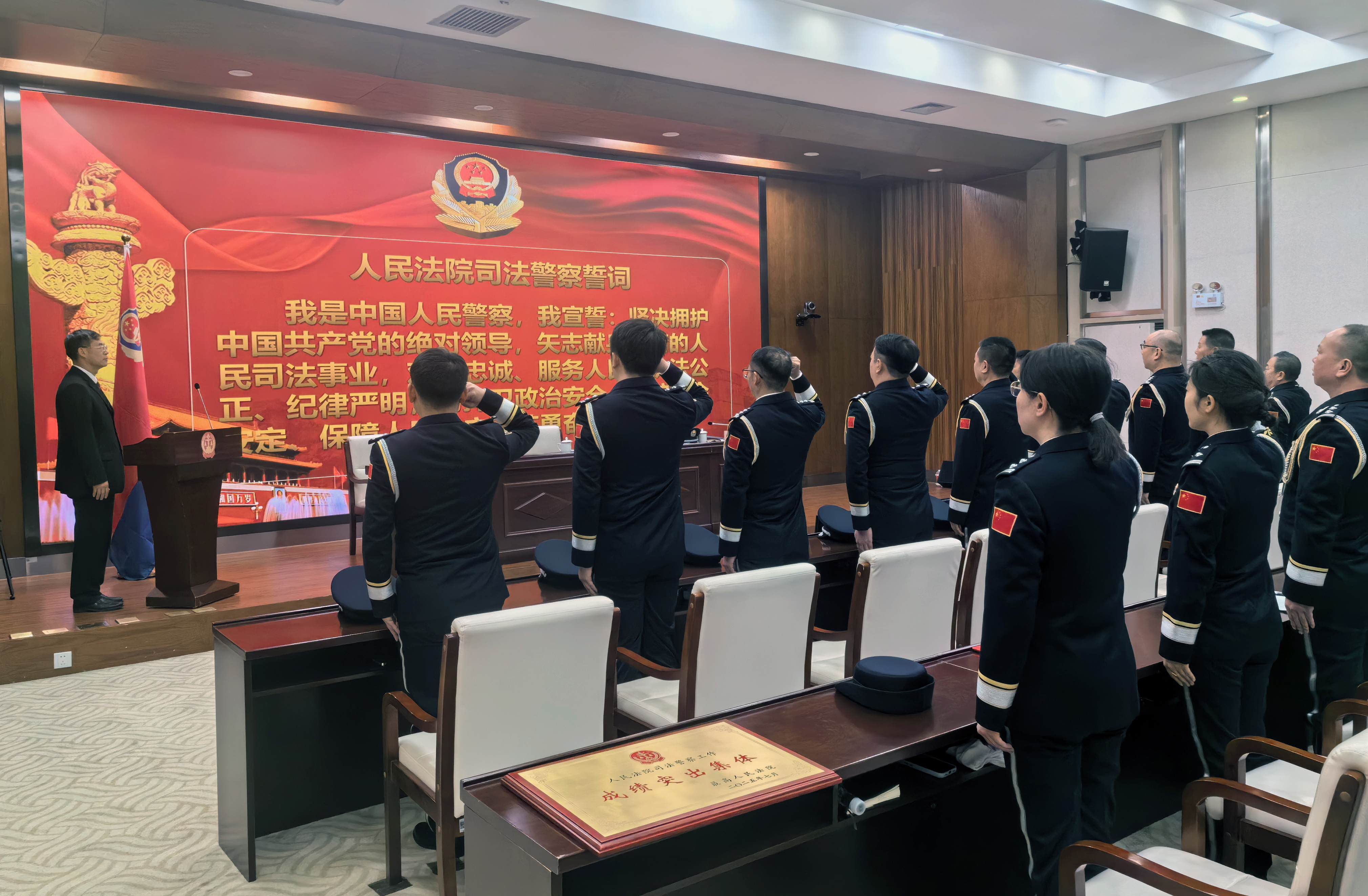 活动在全体司法警察齐声高唱《中华人民共和国国歌》中启幕。院党组成员、副院长袁学红监誓,法警总队副总队长倪振杰领誓,全体司法警察面向警旗庄严宣誓:“我是中国人民警察,我宣誓:坚决拥护中国共产党的绝对领导,矢志献身崇高的人民司法事业,对党忠诚、服务人民、执法公正、纪律严明,为捍卫政治安全、维护社会安定、保障人民安宁而英勇奋斗!”
