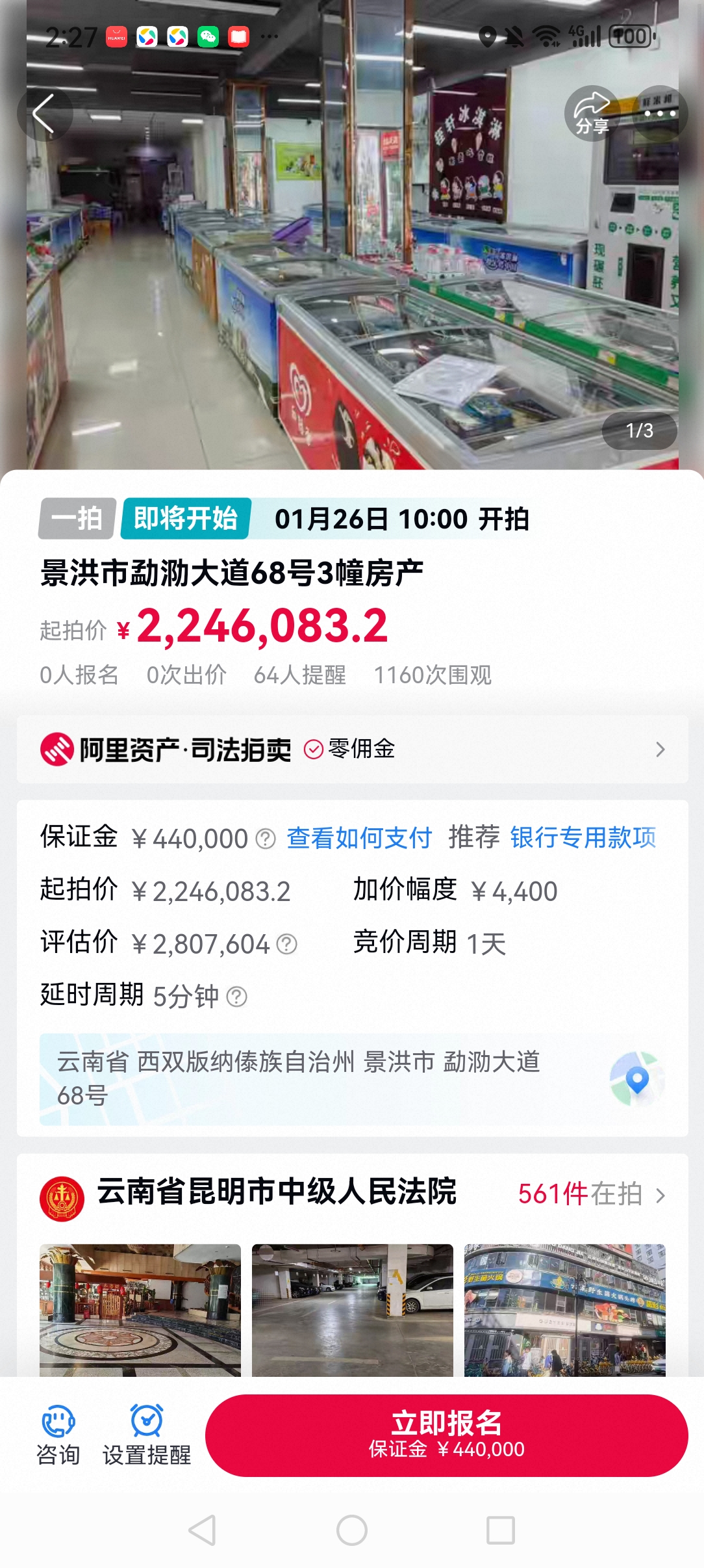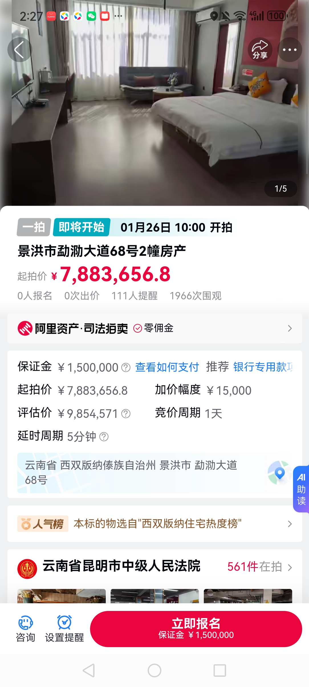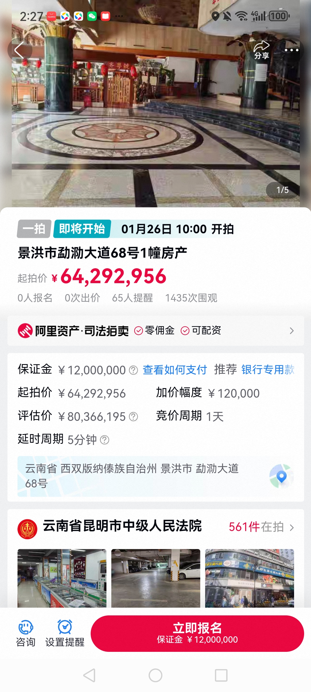 昆明市中级人民法院的拍卖公告显示:2026年1月16日上午10点至1月17日上午10点,昆明中院将公开拍卖西双版纳景洪市勐泐大道68号1幢房产(辉煌都畅酒店)、2幢房产(保伦酒店)、3幢房产(一家冰淇淋店)。两栋酒店建筑面积分别为:14657.34㎡、2468.58㎡,评估价格分别为:80366195元、9854571元,起拍价分别为:64292956元、7883656.8元,拍卖的另一处商铺是一家临街冰淇淋店,建筑面积为325.18㎡,评估价为2807604元,起拍价为2246083.2元,两栋酒店、临街商铺均降价20%作为起拍价。目前,辉煌都畅酒店有1500多人围观,65人设置了提醒,保伦酒店有近2000人围观,111人设置了提醒。拍卖公告提示:两栋酒店及冰淇淋商铺,目前均在经营使用中,拍卖成交后,昆明中院负责腾房。