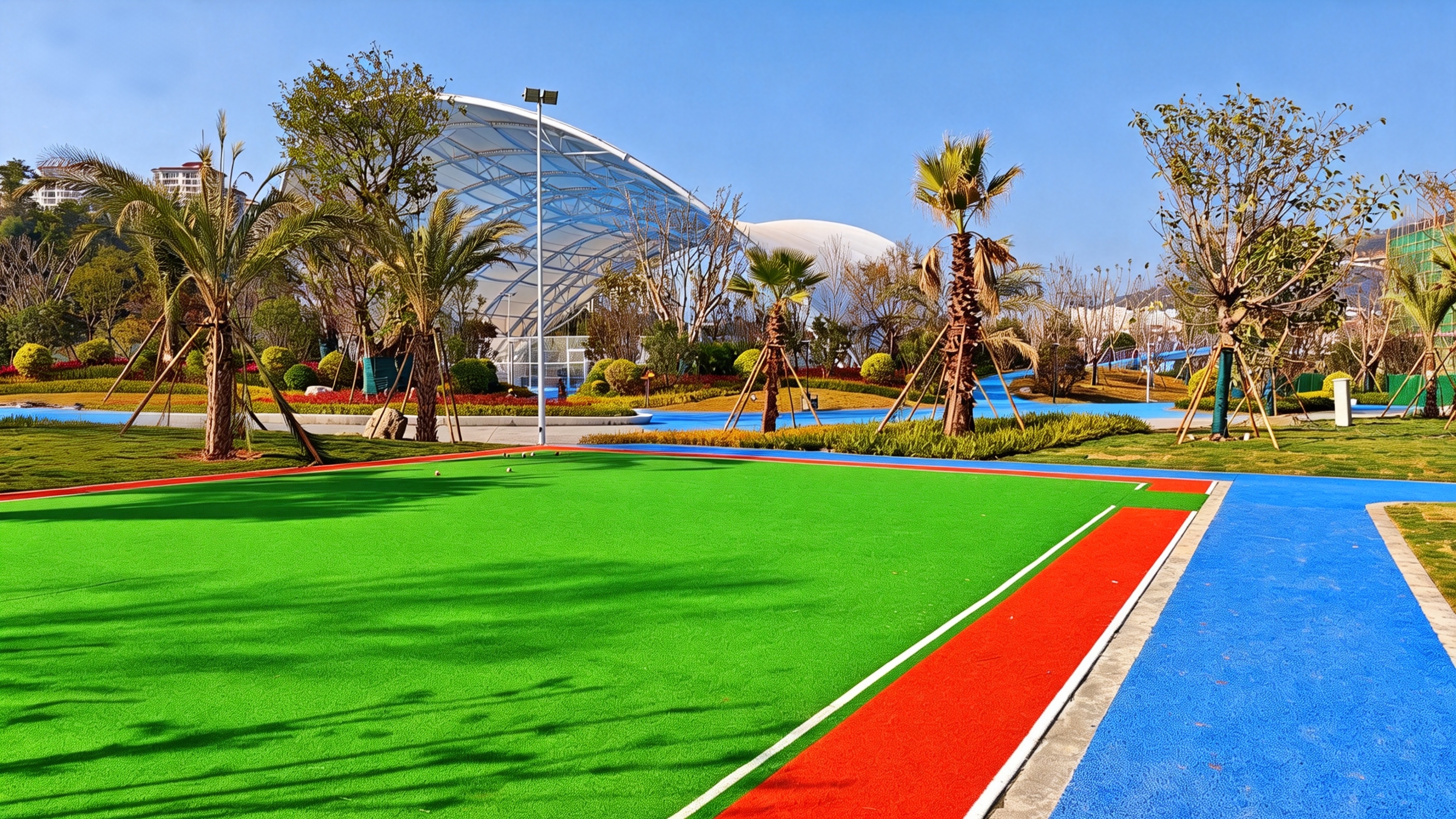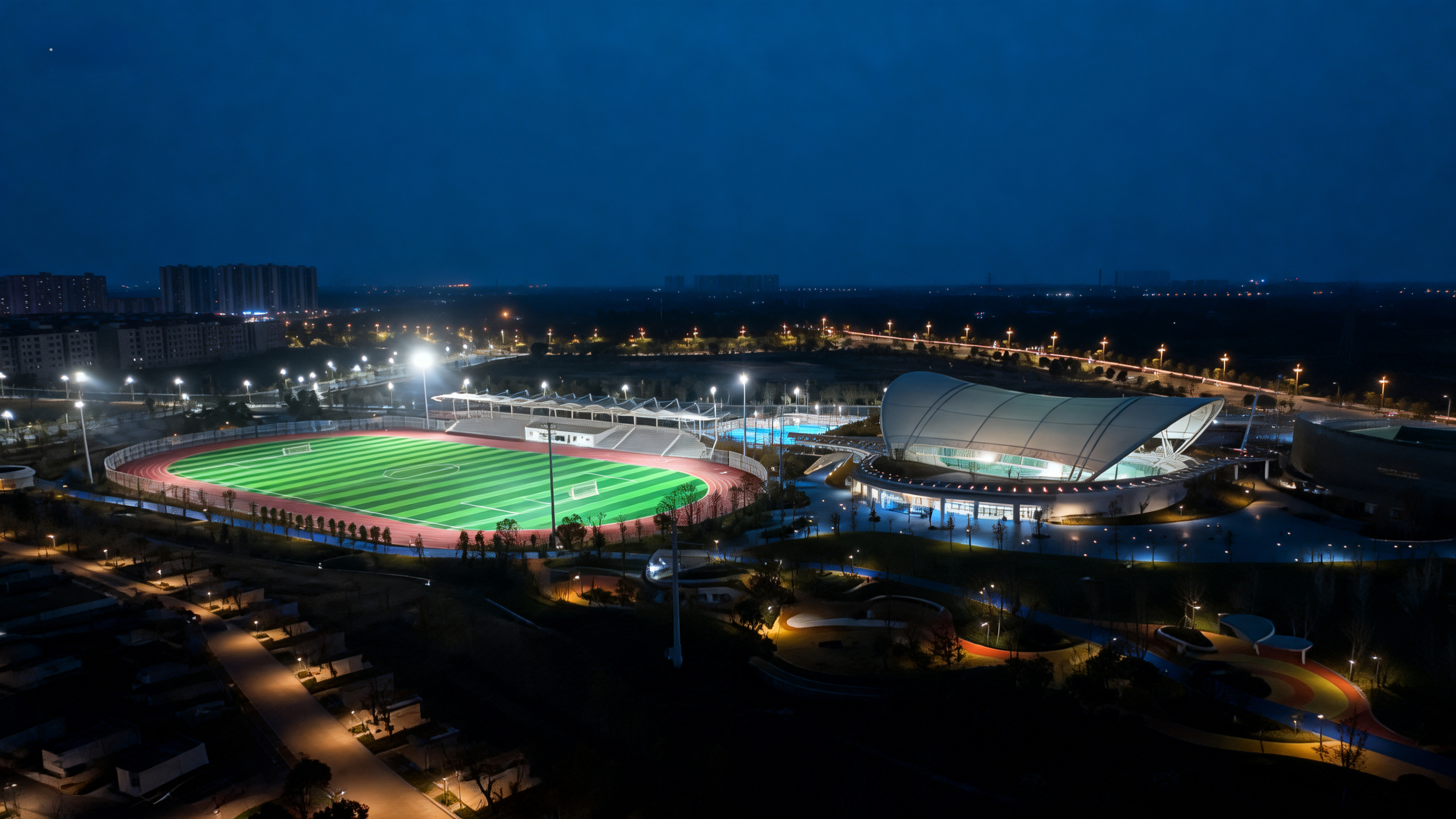公园功能布局兼顾专业赛事与全民健身需求,构建起覆盖全龄的运动服务体系。园内不仅配备标准田径场、足球场、篮球场、网球场等专业设施,还设有儿童活动区、健身广场、智慧步道等休闲场地,并融合商业服务与滨水观景功能,打造“运动+生活”一站式体验,有效提升片区综合服务能力。