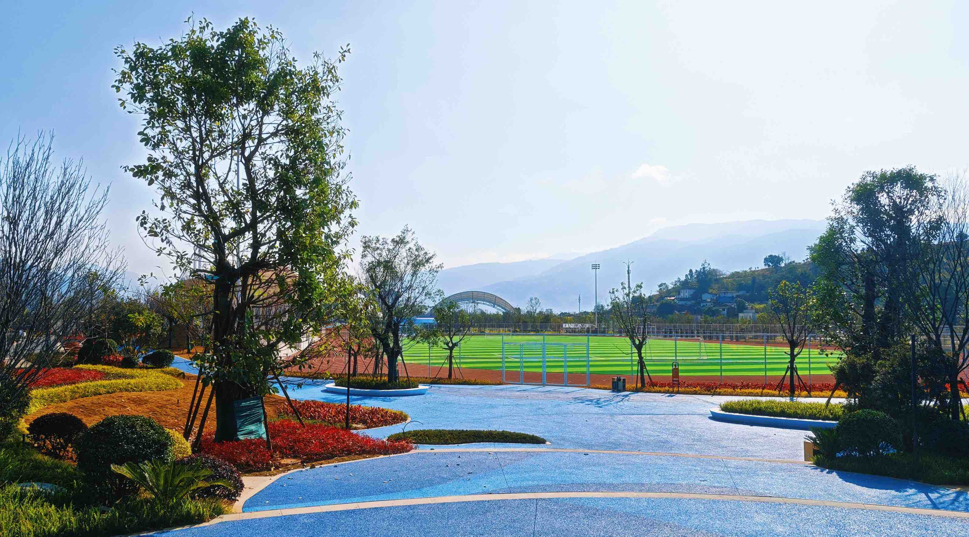 大沙坝体育公园坐落于巧家城市发展核心区,总规划面积约12.84万平方米,生态绿化占比近60%,实现了自然涵养与运动休闲的有机统一。云南交投生态公司在建设中秉持“生态筑基、功能融合、全龄友好”理念,依托场地自然肌理,优选乡土植被与特色树种,通过多层次景观营造,打造出人与自然和谐共生的绿色空间,助力市民实现“推窗见绿、出门入园”的美好愿景。