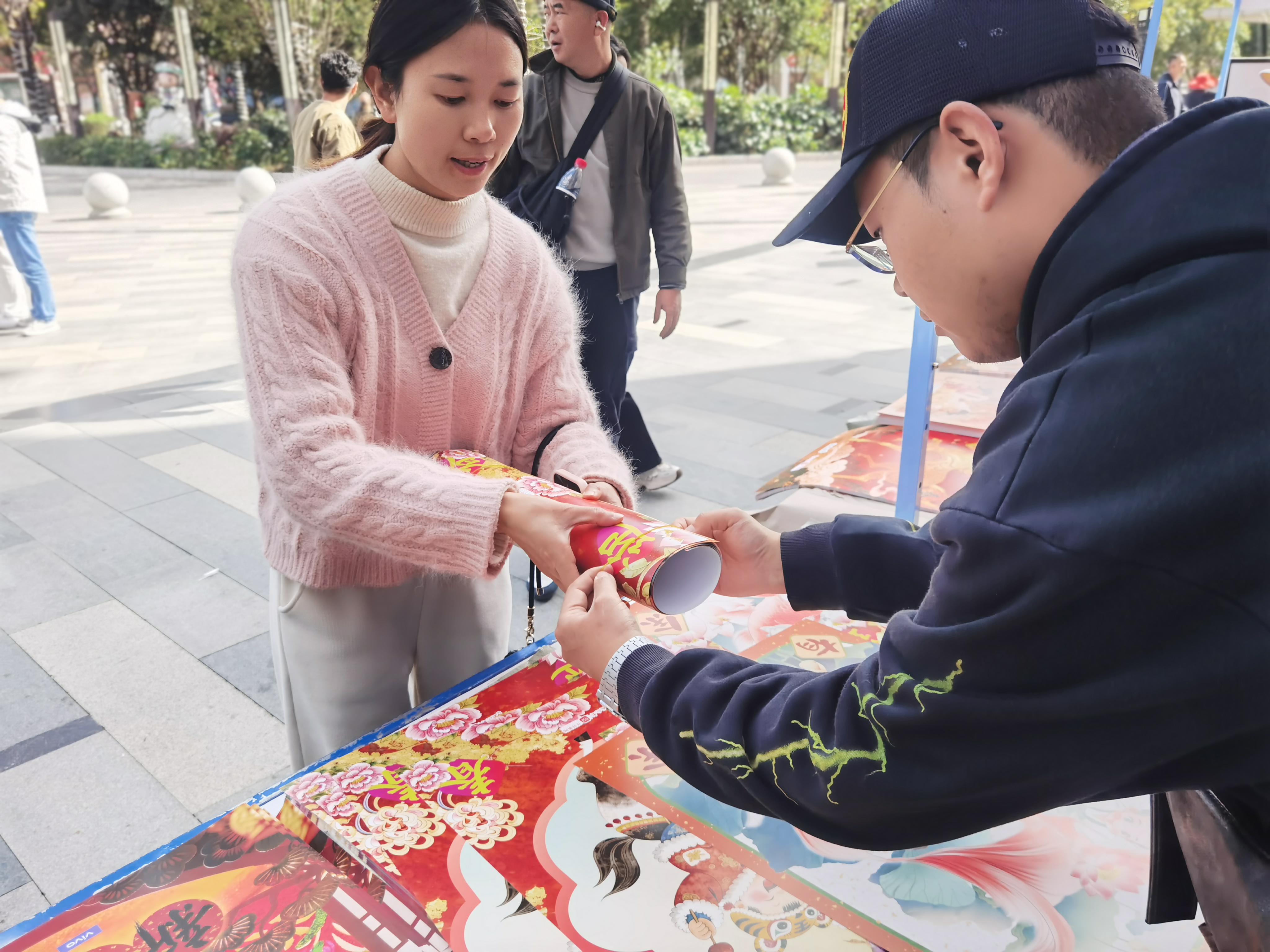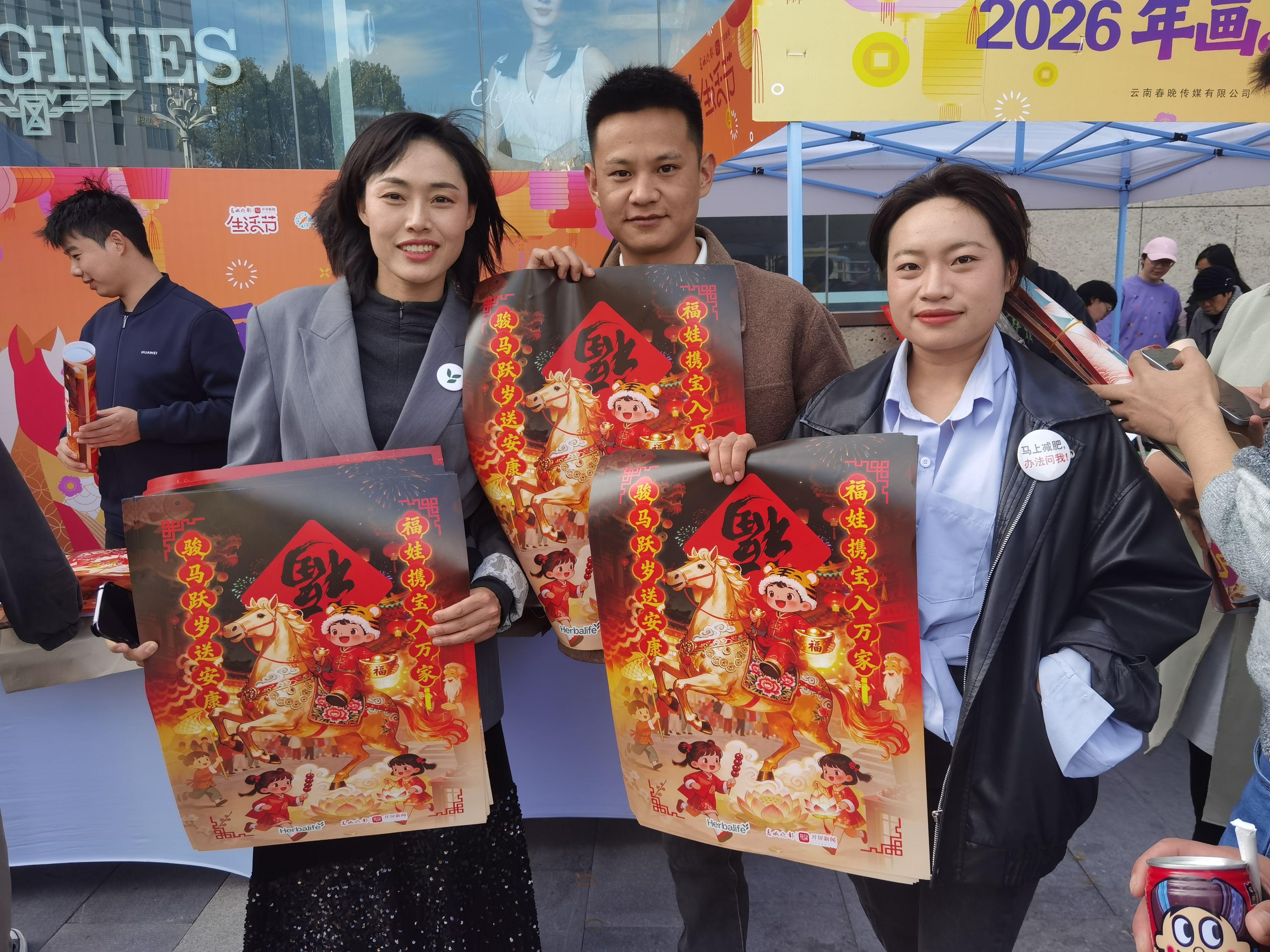 1月25日,2026年“年画欢乐送”首场活动在昆明同德广场热闹开启。活动现场人头攒动、年味十足,红彤彤的年画与春联映衬着浓浓的节日氛围,吸引了众多市民驻足参与。
