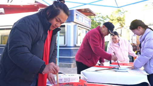 春联书写区内长桌齐整,红纸铺展、墨香萦绕,笔墨纸砚一应俱全。中国书协会员、云南省书协理事唐明全,云南省书协会员杨栋军现场挥毫,为群众书写春联。前来领取的群众纷纷围聚桌旁,有的静心观看书写,有的认真挑选吉言;书法家们凝神运笔,将对新年的祝福凝于笔端、融于字里,一幅幅寓意吉祥的春联在跃然纸上。方寸红笺,承载的是笔墨情韵,更是群众对美好生活的万千期许。